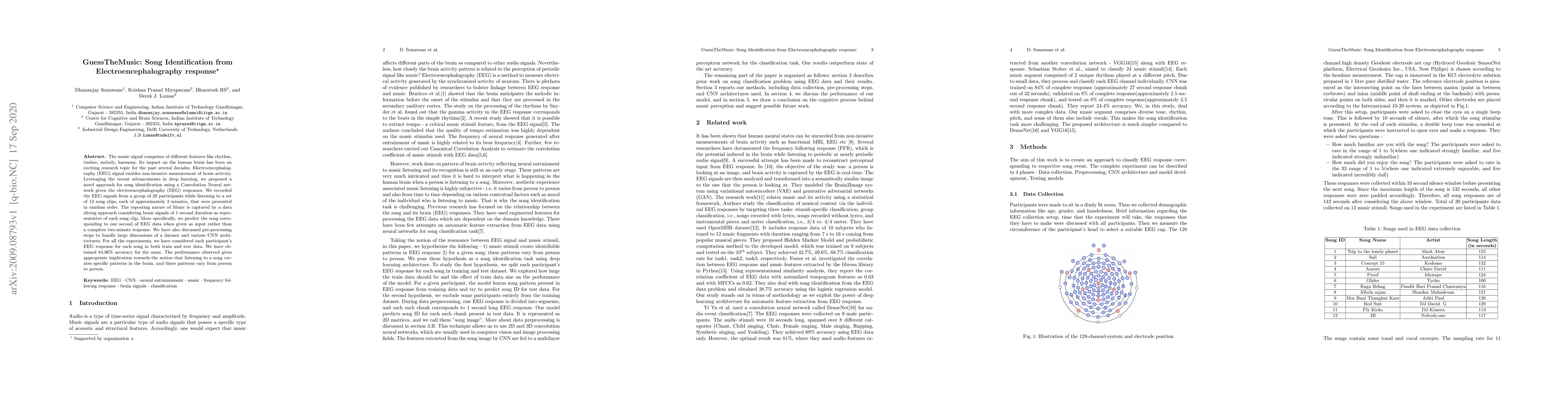 A new approach uses EEG responses to identify songs with 84.96% accuracy, suggesting that listening to a song creates unique brain patterns that can be recognized.