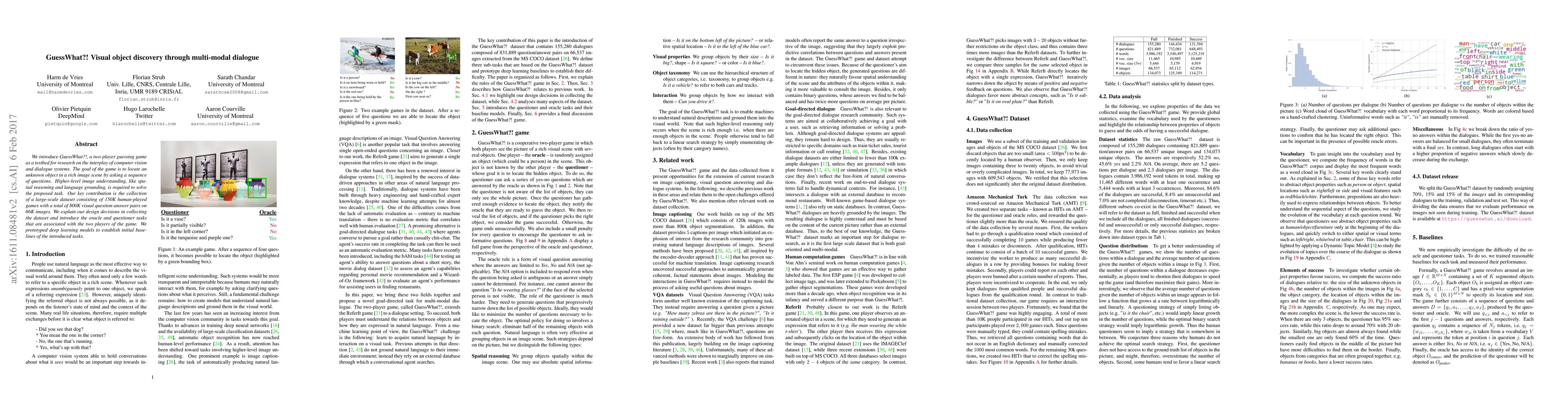 The paper presents GuessWhat?! a game-based testbed for computer vision and dialogue systems, focusing on object location in images via question-asking. It contributes a large dataset of 150K human-played games with 800K visual question-answer pairs across 66K images, along with deep learning models for baseline performance on oracle and questioner tasks.