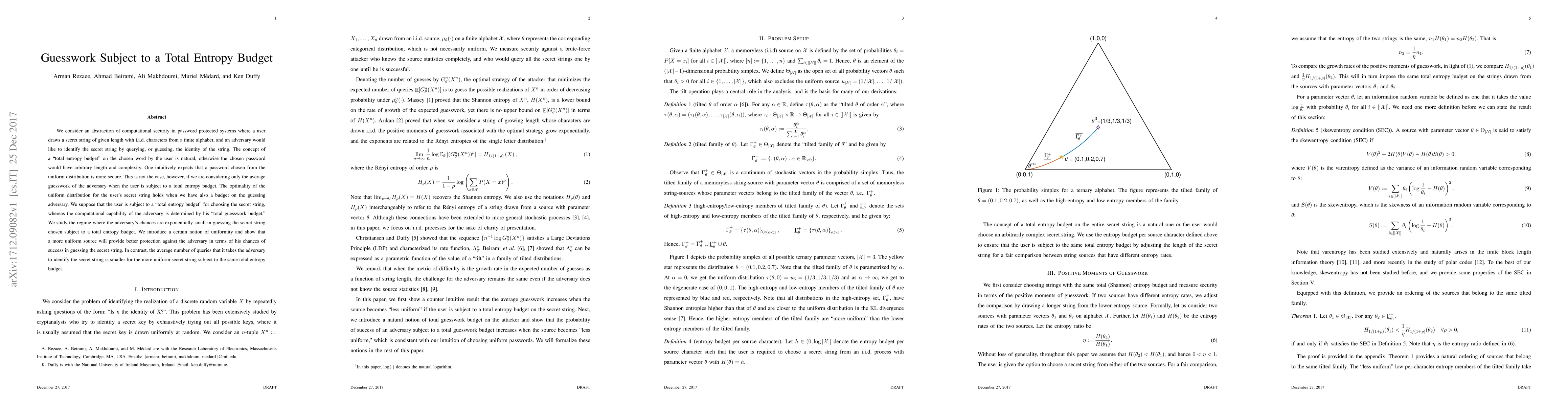 We consider an abstraction of computational security in password protected systems where a user draws a secret string of given length with i.i.d. characters from a finite alphabet, and an adversary would like to identify the secret string by querying, or guessing, the identity of the string. The concept of a "total entropy budget" on the chosen word by the user is natural, otherwise the chosen password would have arbitrary length and complexity. One intuitively expects that a password chosen from the uniform distribution is more secure. This is not the case, however, if we are considering only the average guesswork of the adversary when the user is subject to a total entropy budget. The optimality of the uniform distribution for the user's secret string holds when we have also a budget on the guessing adversary. We suppose that the user is subject to a "total entropy budget" for choosing the secret string, whereas the computational capability of the adversary is determined by his "total guesswork budget." We study the regime where the adversary's chances are exponentially small in guessing the secret string chosen subject to a total entropy budget. We introduce a certain notion of uniformity and show that a more uniform source will provide better protection against the adversary in terms of his chances of success in guessing the secret string. In contrast, the average number of queries that it takes the adversary to identify the secret string is smaller for the more uniform secret string subject to the same total entropy budget.