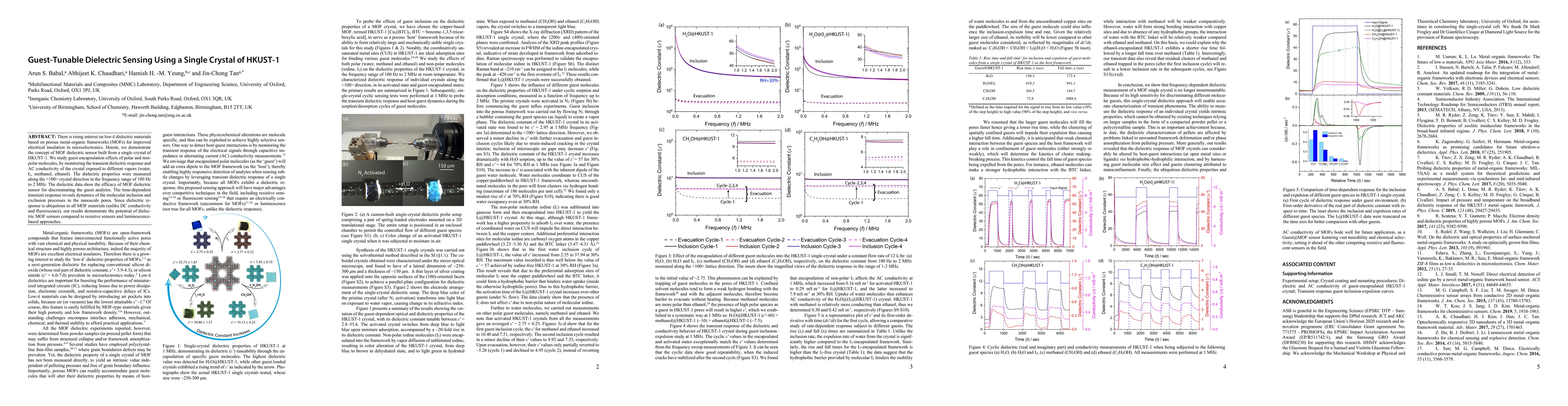 There is rising interest on low-k dielectric materials based on porous metal-organic frameworks (MOFs) for improved electrical insulation in microelectronics. Herein, we demonstrate the concept of MOF dielectric sensor built from a single crystal of HKUST-1. We study guest encapsulation effects of polar and non-polar molecules, by monitoring the transient dielectric response and AC conductivity of the crystal exposed to different vapors (water, I2, methanol, ethanol). The dielectric properties were measured along the <100> crystal direction in the frequency range of 100 Hz to 2 MHz. The dielectric data show the efficacy of MOF dielectric sensor for discriminating the guest analytes. The time-dependent transient response reveals dynamics of the molecular inclusion and exclusion processes in the nanoscale pores. Since dielectric response is ubiquitous to all MOF materials (unlike DC conductivity and fluorescence), our results demonstrate the potential of dielectric MOF sensors compared to resistive sensors and luminescence-based approaches.