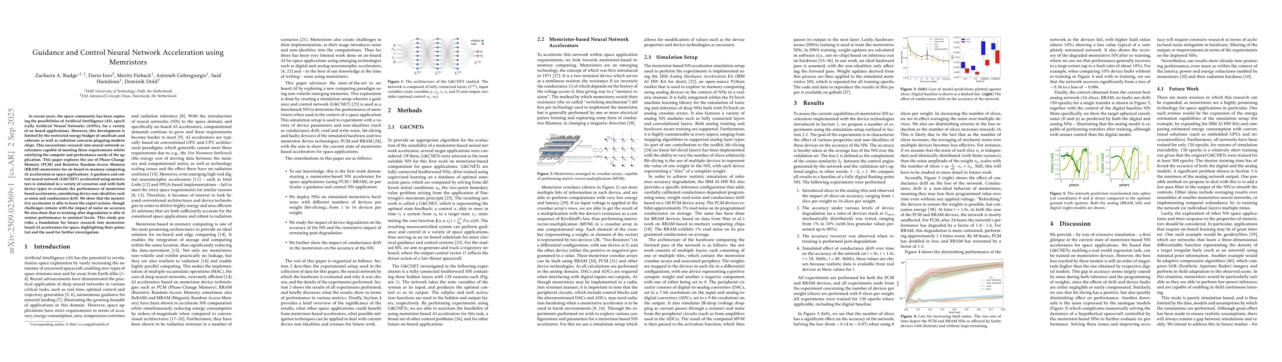 In recent years, the space community has been exploring the possibilities of Artificial Intelligence (AI), specifically Artificial Neural Networks (ANNs), for a variety of on board applications. However, this development is limited by the restricted energy budget of smallsats and cubesats as well as radiation concerns plaguing modern chips. This necessitates research into neural network accelerators capable of meeting these requirements whilst satisfying the compute and performance needs of the application. This paper explores the use of Phase-Change Memory (PCM) and Resistive Random-Access Memory (RRAM) memristors for on-board in-memory computing AI acceleration in space applications. A guidance and control neural network (G\&CNET) accelerated using memristors is simulated in a variety of scenarios and with both device types to evaluate the performance of memristor-based accelerators, considering device non-idealities such as noise and conductance drift. We show that the memristive accelerator is able to learn the expert actions, though challenges remain with the impact of noise on accuracy. We also show that re-training after degradation is able to restore performance to nominal levels. This study provides a foundation for future research into memristor-based AI accelerators for space, highlighting their potential and the need for further investigation.