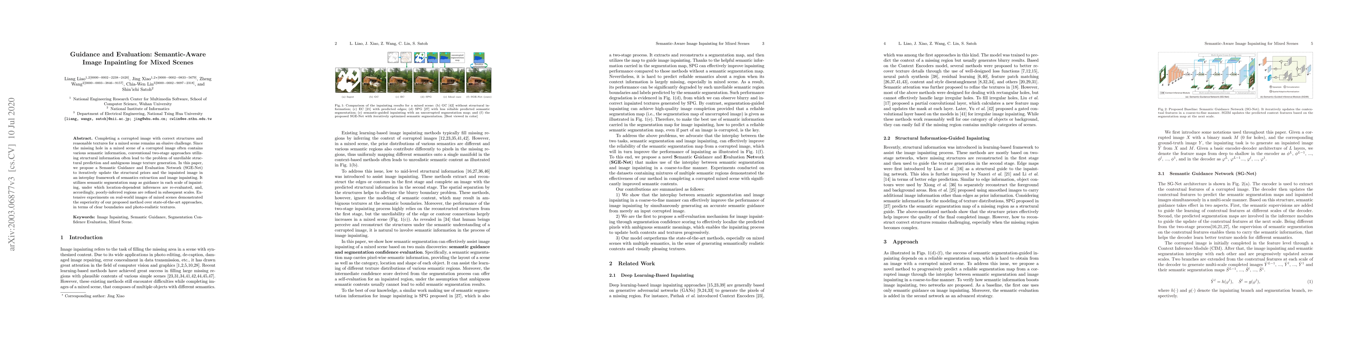 The paper proposes a Semantic Guidance and Evaluation Network (SGE-Net) to improve image inpainting for mixed scenes by iteratively updating structural priors and textures using semantic segmentation maps. The method outperforms existing techniques, achieving clearer boundaries and more realistic textures in corrupted images.