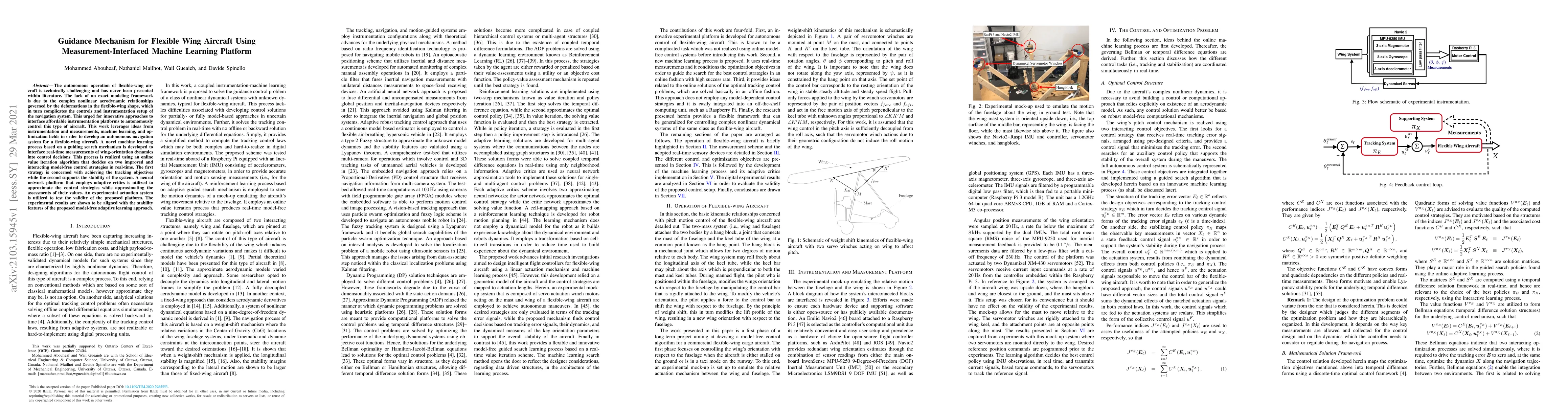 The autonomous operation of flexible-wing aircraft is technically challenging and has never been presented within literature. The lack of an exact modeling framework is due to the complex nonlinear aerodynamic relationships governed by the deformations in the flexible-wing shape, which in turn complicates the controls and instrumentation setup of the navigation system. This urged for innovative approaches to interface affordable instrumentation platforms to autonomously control this type of aircraft. This work leverages ideas from instrumentation and measurements, machine learning, and optimization fields in order to develop an autonomous navigation system for a flexible-wing aircraft. A novel machine learning process based on a guiding search mechanism is developed to interface real-time measurements of wing-orientation dynamics into control decisions. This process is realized using an online value iteration algorithm that decides on two improved and interacting model-free control strategies in real-time. The first strategy is concerned with achieving the tracking objectives while the second supports the stability of the system. A neural network platform that employs adaptive critics is utilized to approximate the control strategies while approximating the assessments of their values. An experimental actuation system is utilized to test the validity of the proposed platform. The experimental results are shown to be aligned with the stability features of the proposed model-free adaptive learning approach.