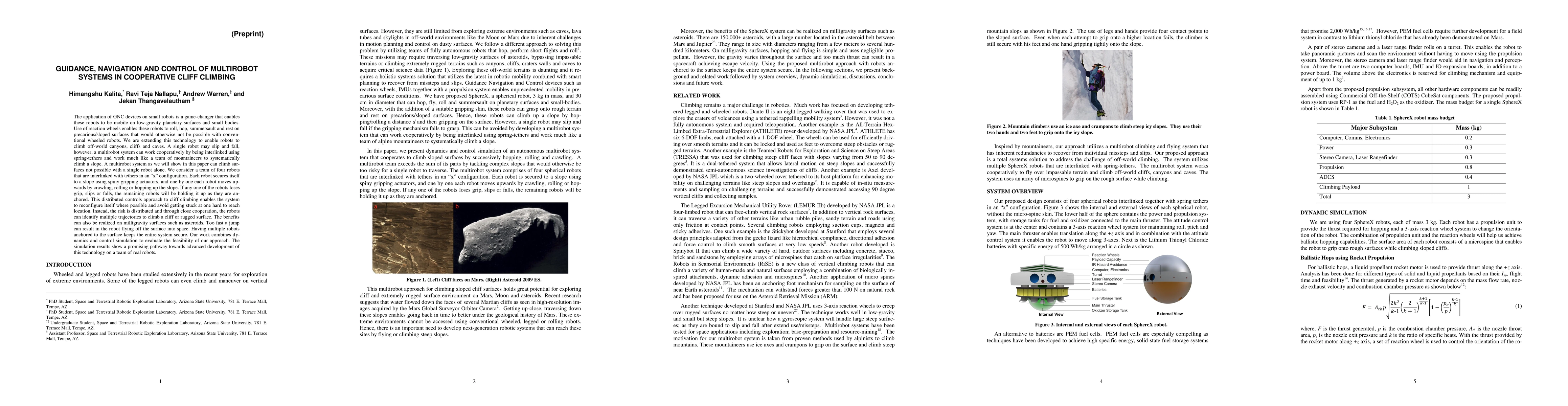 The application of GNC devices on small robots is a game-changer that enables these robots to be mobile on low-gravity planetary surfaces and small bodies. Use of reaction wheels enables these robots to roll, hop, summersault and rest on precarious/sloped surfaces that would otherwise not be possible with conven-tional wheeled robots. We are extending this technology to enable robots to climb off-world canyons, cliffs and caves. A single robot may slip and fall, however, a multirobot system can work cooperatively by being interlinked using spring-tethers and work much like a team of mountaineers to systematically climb a slope. A multirobot system as we will show in this paper can climb sur-faces not possible with a single robot alone. We consider a team of four robots that are interlinked with tethers in an 'x' configuration. Each robot secures itself to a slope using spiny gripping actuators, and one by one each robot moves up-wards by crawling, rolling or hopping up the slope. If any one of the robots loses grip, slips or falls, the remaining robots will be holding it up as they are anchored. This distributed controls approach to cliff climbing enables the system to reconfigure itself where possible and avoid getting stuck at one hard to reach location. Instead, the risk is distributed and through close cooperation, the robots can identify multiple trajectories to climb a cliff or rugged surface. The benefits can also be realized on milligravity surfaces such as asteroids. Too fast a jump can result in the robot flying off the surface into space. Having multiple robots anchored to the surface keeps the entire system secure. Our work combines dynamics and control simulation to evaluate the feasibility of our approach. The simulation results show a promising pathway towards advanced development of this technology on a team of real robots.