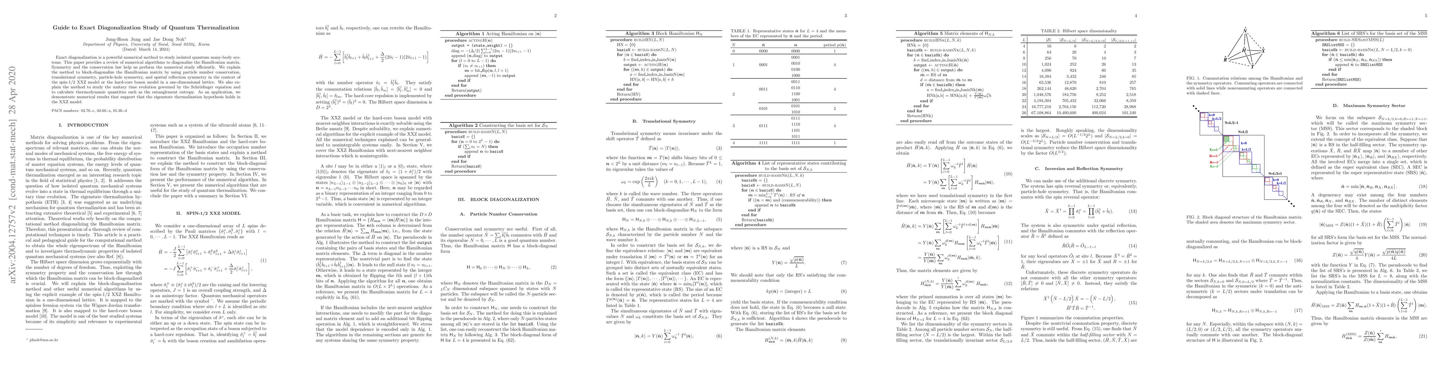 Exact diagonalization is a powerful numerical method to study isolated quantum many-body systems. This paper provides a review of numerical algorithms to diagonalize the Hamiltonian matrix. Symmetry and the conservation law help us perform the numerical study efficiently. We explain the method to block-diagonalize the Hamiltonian matrix by using particle number conservation, translational symmetry, particle-hole symmetry, and spatial reflection symmetry in the context of the spin-1/2 XXZ model or the hard-core boson model in a one-dimensional lattice. We also explain the method to study the unitary time evolution governed by the Schr\"odinger equation and to calculate thermodynamic quantities such as the entanglement entropy. As an application, we demonstrate numerical results that support that the eigenstate thermalization hypothesis holds in the XXZ model.