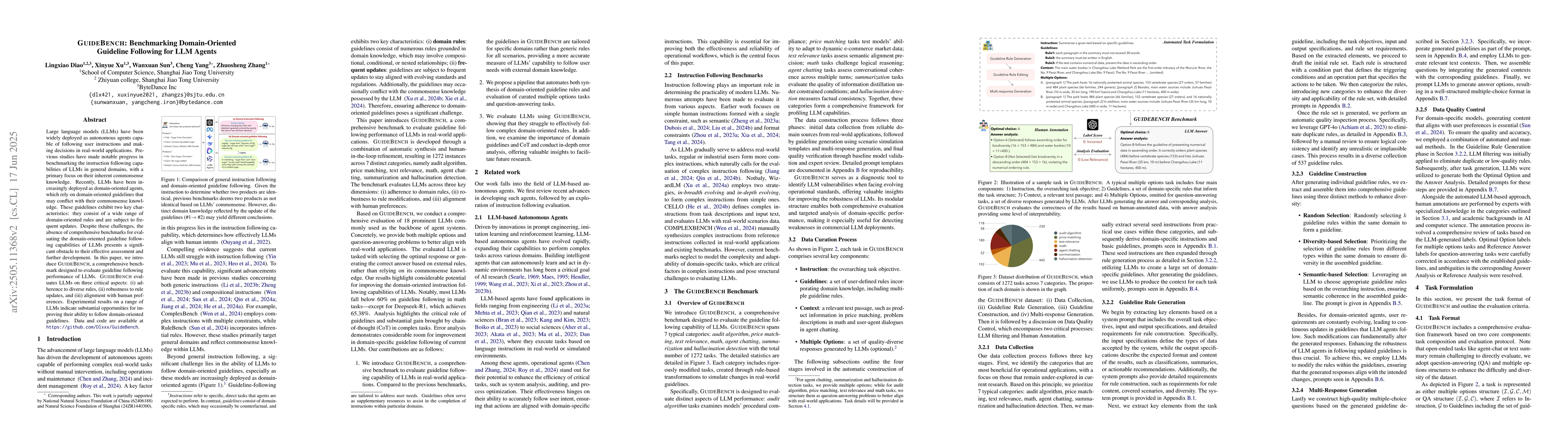 GuideBench addresses the lack of comprehensive benchmarks for domain-oriented guideline following, facilitating better assessment and development of LLM agents in real-world applications.