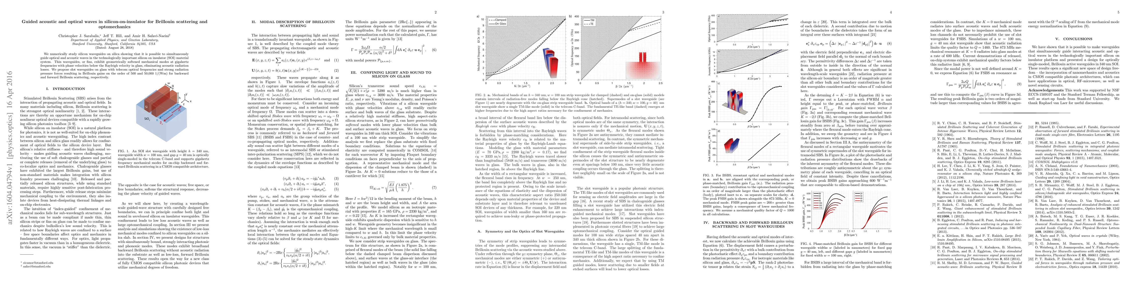 We numerically study silicon waveguides on silica showing that it is possible to simultaneously guide optical and acoustic waves in the technologically important silicon on insulator (SOI) material system. Thin waveguides, or fins, exhibit geometrically softened mechanical modes at gigahertz frequencies with phase velocities below the Rayleigh velocity in glass, eliminating acoustic radiation losses. We propose slot waveguides on glass with telecom optical frequencies and strong radiation pressure forces resulting in Brillouin gains on the order of 500 and 50,000 1/(Wm) for backward and forward Brillouin scattering, respectively.