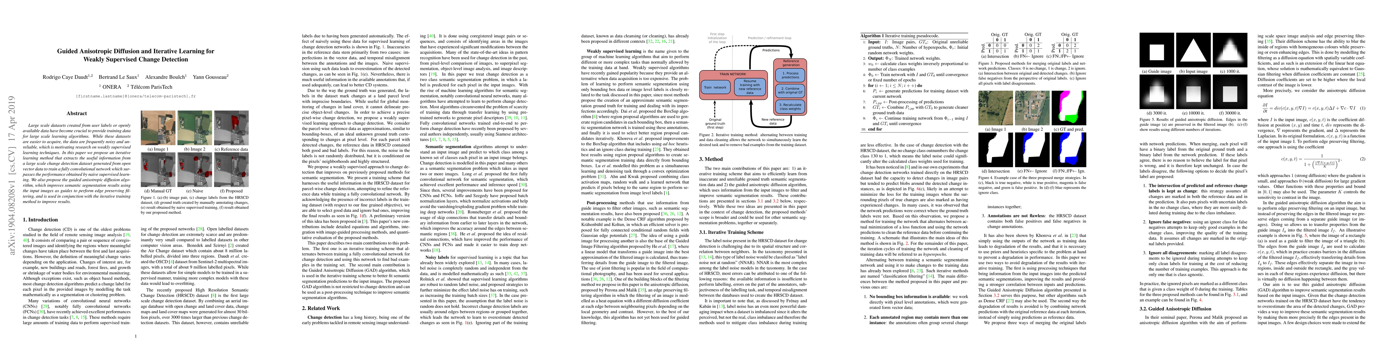 This paper proposes an iterative learning method to extract useful information from noisy, weakly supervised change detection datasets, training a fully convolutional network that outperforms naive supervised learning. It also introduces a guided anisotropic diffusion algorithm to enhance semantic segmentation results by edge-preserving filtering, improving the overall performance when used with the iterative training approach.