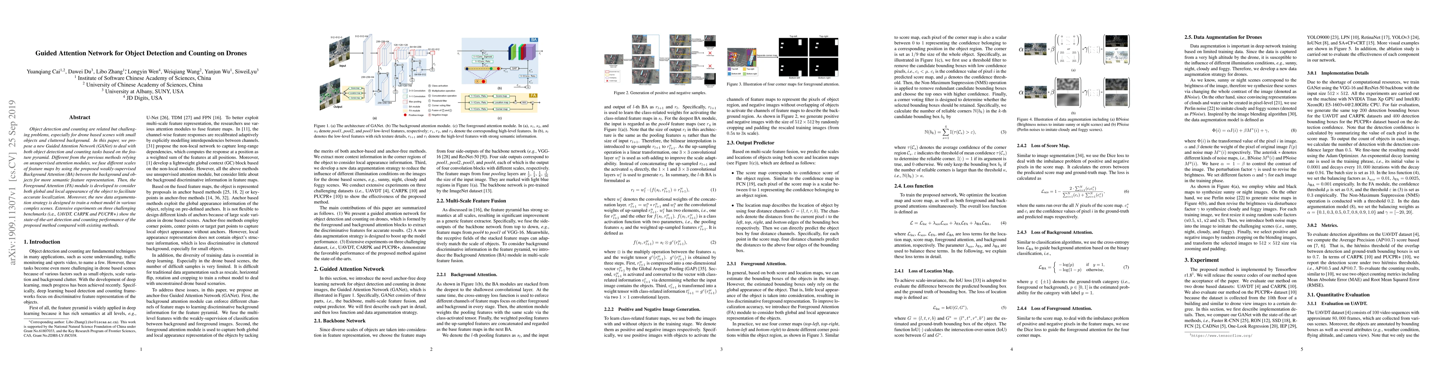 The paper proposes a Guided Attention Network (GANet) for object detection and counting in drone-based scenes using a feature pyramid and weakly-supervised attention modules. The method achieves state-of-the-art performance on three benchmarks by leveraging background and foreground attention for semantic feature representation.