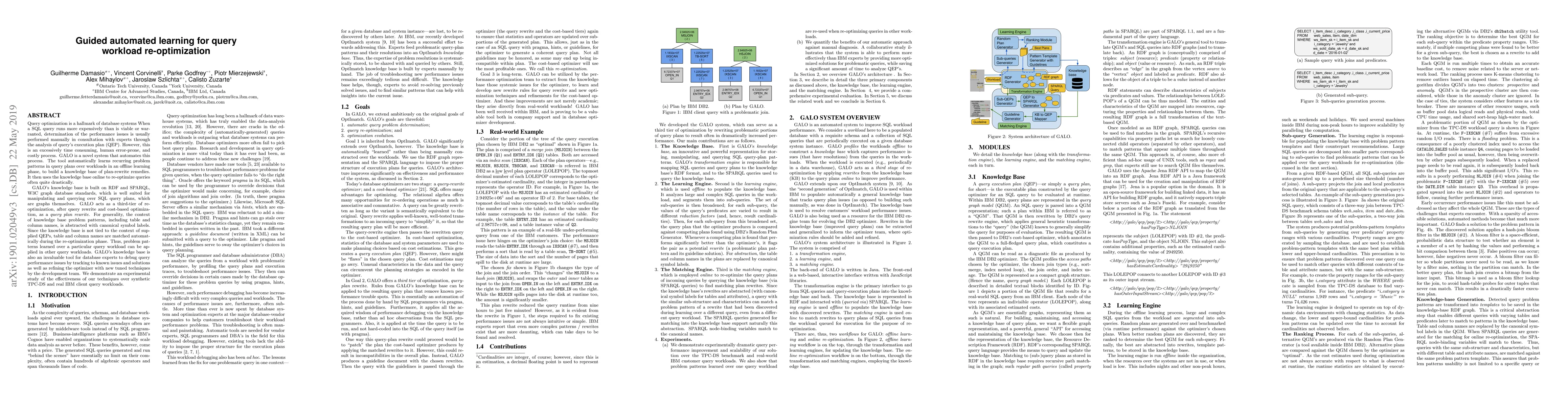 **Summary:** GALO automates query optimization by learning recurring performance issues from query execution plans and applying corrective rewrites. It employs an RDF-based knowledge base to generalize and apply fixes across different workloads, significantly improving query efficiency.