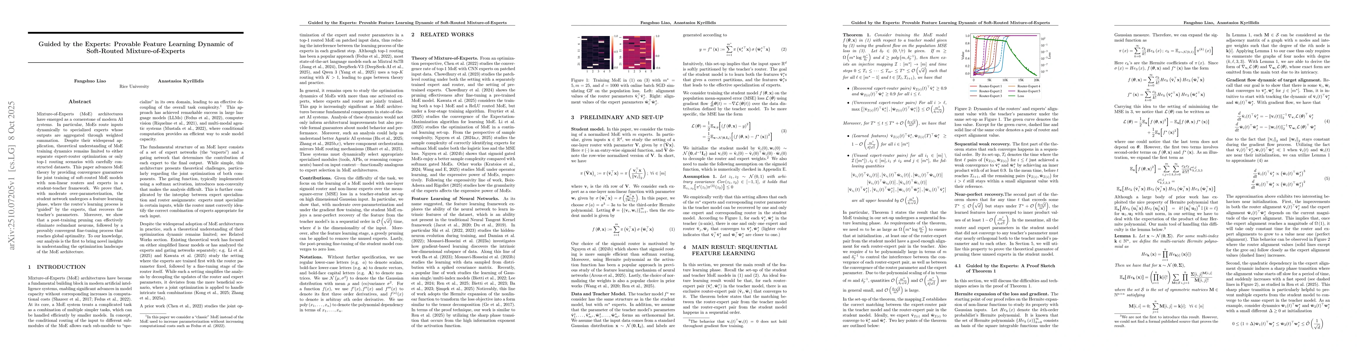 Mixture-of-Experts (MoE) architectures have emerged as a cornerstone of modern AI systems. In particular, MoEs route inputs dynamically to specialized experts whose outputs are aggregated through weighted summation. Despite their widespread application, theoretical understanding of MoE training dynamics remains limited to either separate expert-router optimization or only top-1 routing scenarios with carefully constructed datasets. This paper advances MoE theory by providing convergence guarantees for joint training of soft-routed MoE models with non-linear routers and experts in a student-teacher framework. We prove that, with moderate over-parameterization, the student network undergoes a feature learning phase, where the router's learning process is ``guided'' by the experts, that recovers the teacher's parameters. Moreover, we show that a post-training pruning can effectively eliminate redundant neurons, followed by a provably convergent fine-tuning process that reaches global optimality. To our knowledge, our analysis is the first to bring novel insights in understanding the optimization landscape of the MoE architecture.