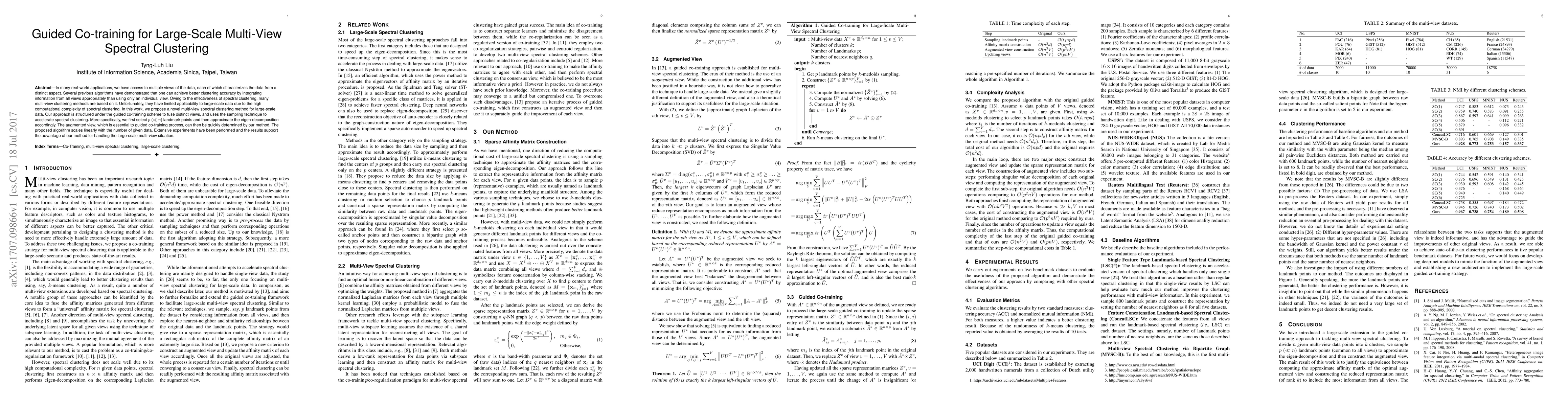 This paper proposes a guided co-training method for large-scale multi-view spectral clustering, utilizing a sampling technique to approximate eigen-decomposition and significantly reduce computational complexity, achieving linear scalability with data size. Experimental results demonstrate the method's effectiveness in handling large-scale multi-view clustering tasks.