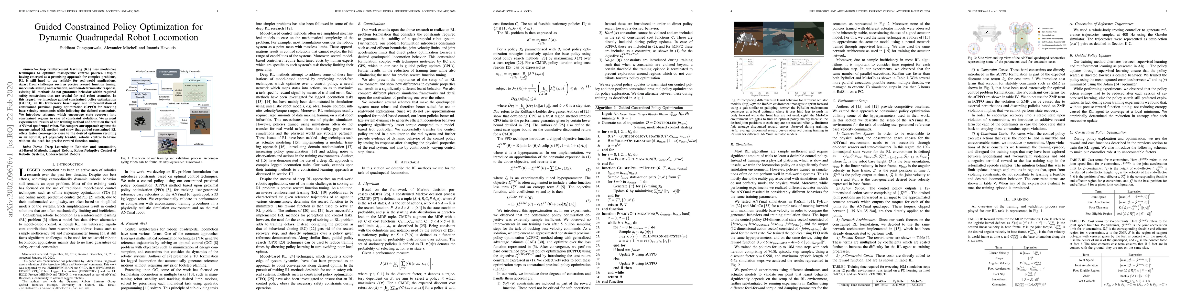 Deep reinforcement learning (RL) uses model-free techniques to optimize task-specific control policies. Despite having emerged as a promising approach for complex problems, RL is still hard to use reliably for real-world applications. Apart from challenges such as precise reward function tuning, inaccurate sensing and actuation, and non-deterministic response, existing RL methods do not guarantee behavior within required safety constraints that are crucial for real robot scenarios. In this regard, we introduce guided constrained policy optimization (GCPO), an RL framework based upon our implementation of constrained proximal policy optimization (CPPO) for tracking base velocity commands while following the defined constraints. We also introduce schemes which encourage state recovery into constrained regions in case of constraint violations. We present experimental results of our training method and test it on the real ANYmal quadruped robot. We compare our approach against the unconstrained RL method and show that guided constrained RL offers faster convergence close to the desired optimum resulting in an optimal, yet physically feasible, robotic control behavior without the need for precise reward function tuning.