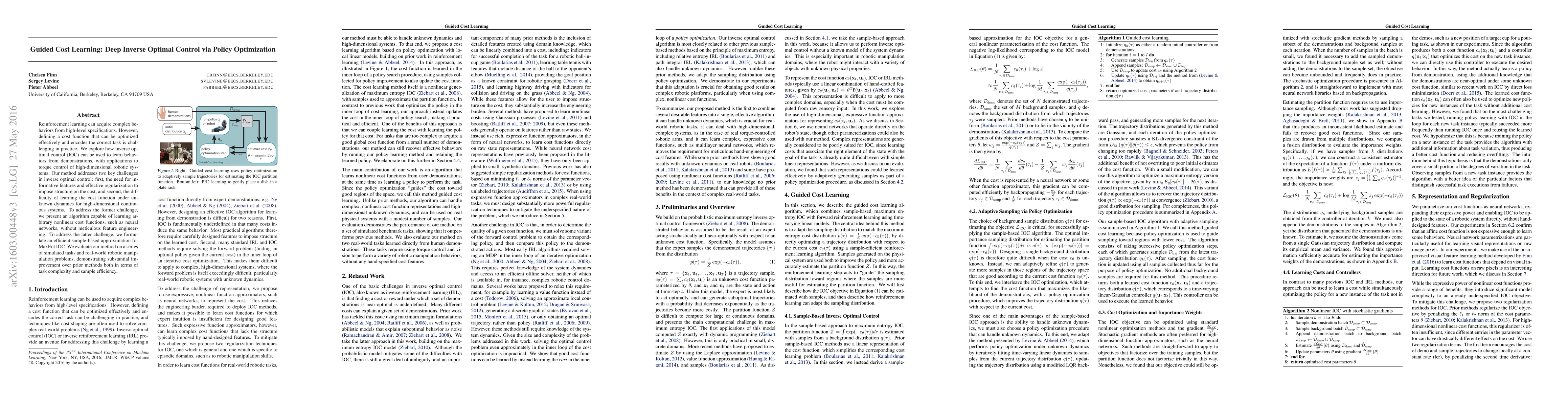 This paper proposes a method for deep inverse optimal control via policy optimization to learn complex behaviors from high-level specifications. It addresses challenges in learning cost functions for high-dimensional systems by using neural networks for cost representation and an efficient sample-based approximation for MaxEnt IOC, showing improved performance in both simulated and real robotic tasks.