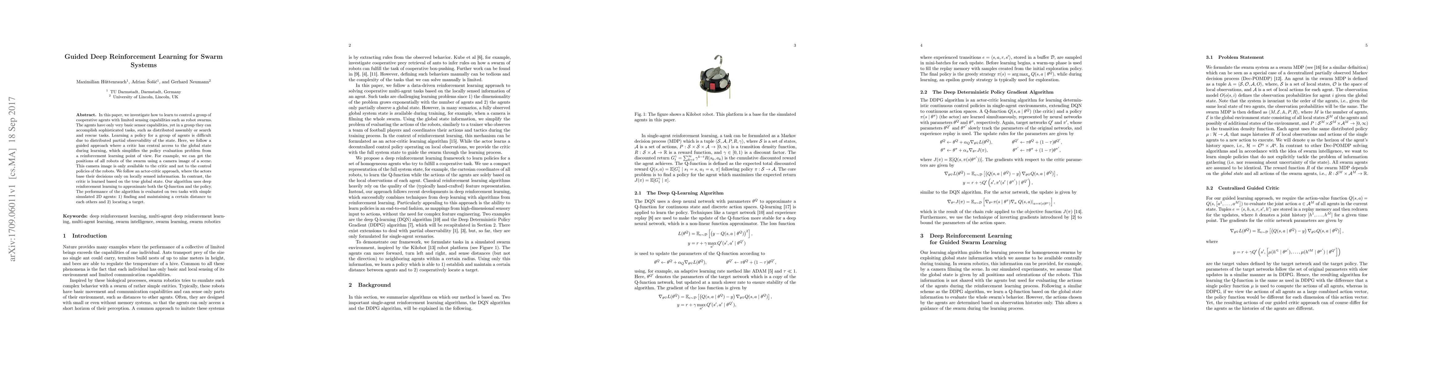 This paper explores guided deep reinforcement learning for controlling robot swarms with limited sensing. It employs an actor-critic method where actors use local information while the critic accesses the global state, simplifying policy evaluation and enabling sophisticated group tasks. The algorithm's performance is tested on simulated swarm tasks like maintaining distance and locating a target.