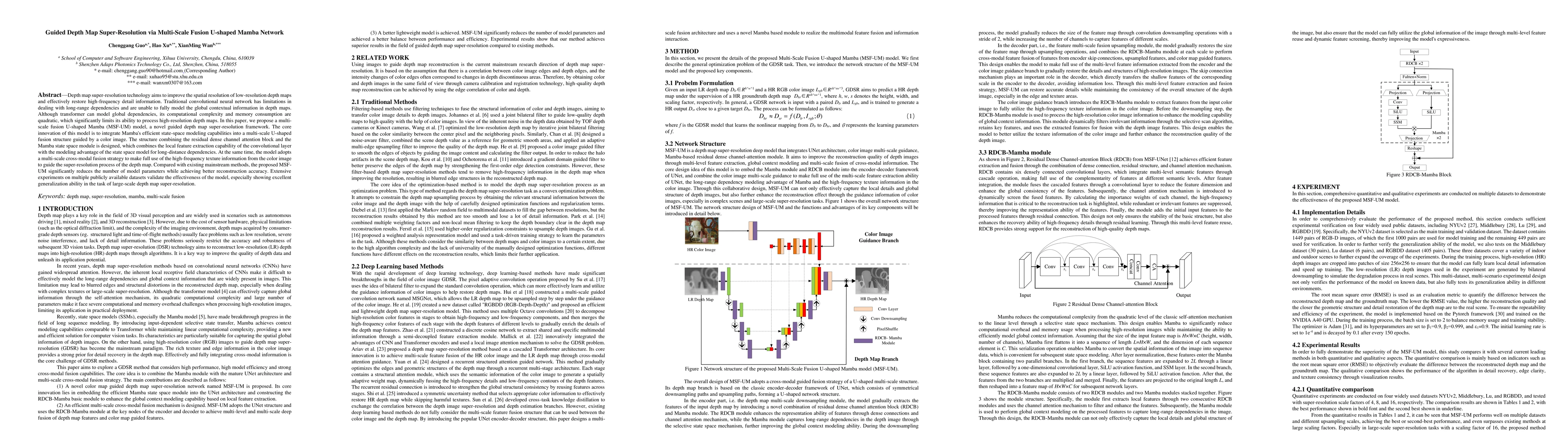 Depth map super-resolution technology aims to improve the spatial resolution of low-resolution depth maps and effectively restore high-frequency detail information. Traditional convolutional neural network has limitations in dealing with long-range dependencies and are unable to fully model the global contextual information in depth maps. Although transformer can model global dependencies, its computational complexity and memory consumption are quadratic, which significantly limits its ability to process high-resolution depth maps. In this paper, we propose a multi-scale fusion U-shaped Mamba (MSF-UM) model, a novel guided depth map super-resolution framework. The core innovation of this model is to integrate Mamba's efficient state-space modeling capabilities into a multi-scale U-shaped fusion structure guided by a color image. The structure combining the residual dense channel attention block and the Mamba state space module is designed, which combines the local feature extraction capability of the convolutional layer with the modeling advantage of the state space model for long-distance dependencies. At the same time, the model adopts a multi-scale cross-modal fusion strategy to make full use of the high-frequency texture information from the color image to guide the super-resolution process of the depth map. Compared with existing mainstream methods, the proposed MSF-UM significantly reduces the number of model parameters while achieving better reconstruction accuracy. Extensive experiments on multiple publicly available datasets validate the effectiveness of the model, especially showing excellent generalization ability in the task of large-scale depth map super-resolution.