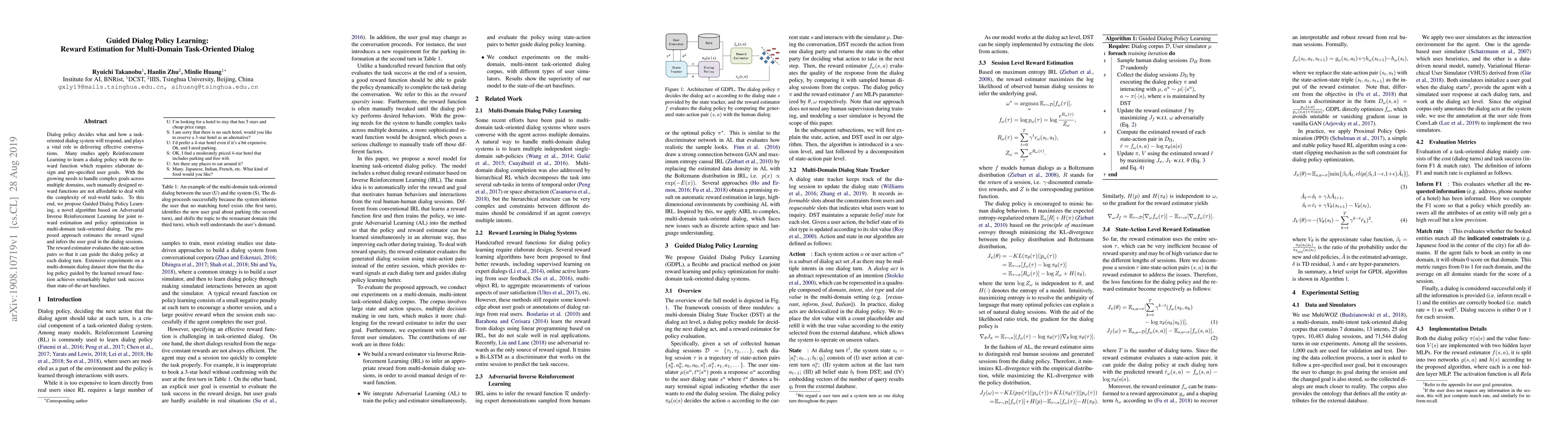 This paper proposes Guided Dialog Policy Learning, an Adversarial Inverse Reinforcement Learning approach for jointly estimating rewards and optimizing policies in multi-domain task-oriented dialogs. The method shows significant improvements in task success compared to state-of-the-art baselines through extensive experiments on a multi-domain dataset.
