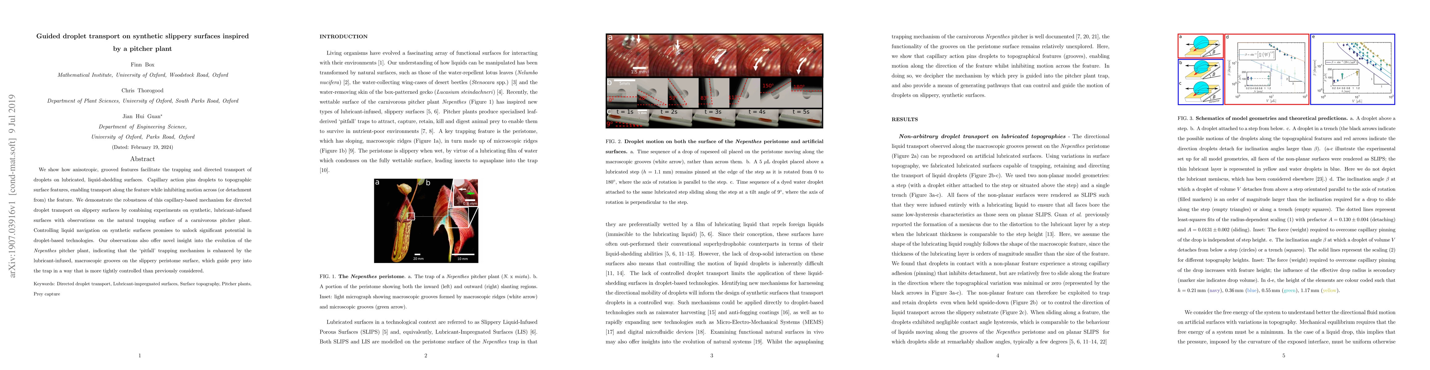 This research demonstrates how engineered, anisotropic grooves on slippery surfaces can guide and transport droplets via capillary action, drawing inspiration from the trapping mechanisms of Nepenthes pitcher plants. The study combines synthetic lubricant-infused surfaces with biological observations to reveal the evolutionary advantages of such droplet-guiding structures.