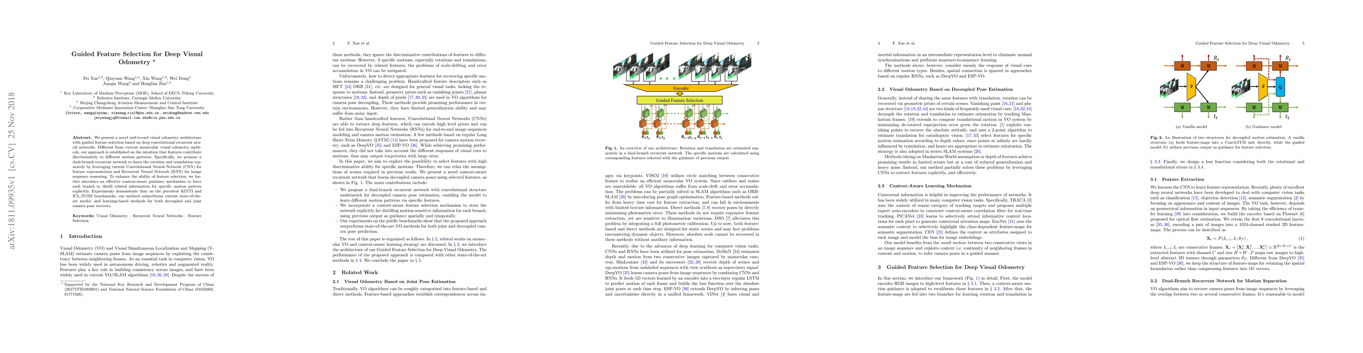 This paper introduces an end-to-end visual odometry system using deep learning with guided feature selection, employing CNNs for feature extraction and RNNs for motion pattern reasoning. The proposed dual-branch RNN enhances feature selection and outperforms existing methods on KITTI and ICL_NUIM benchmarks.