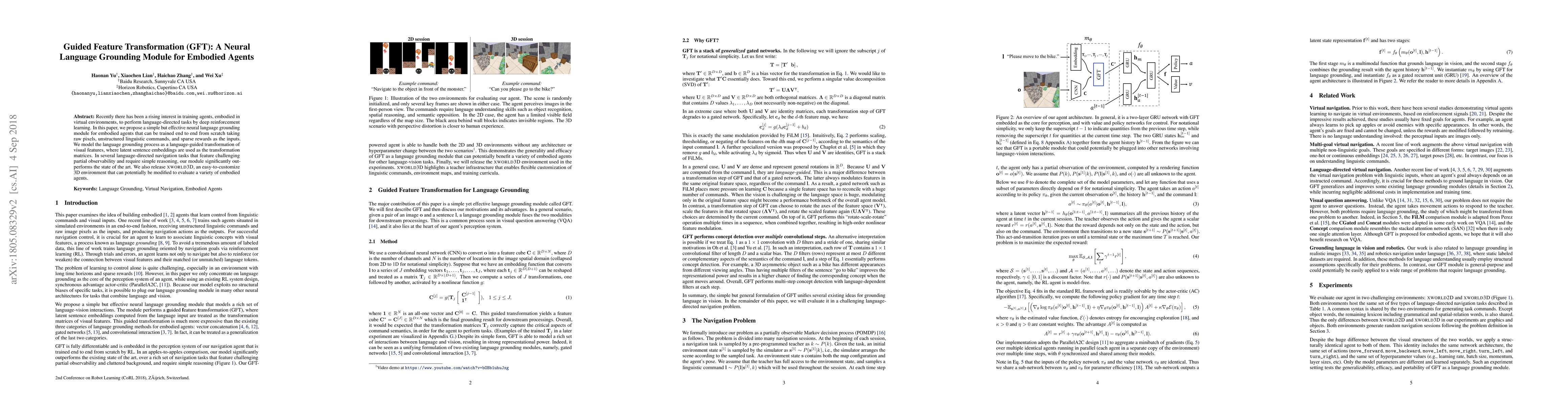 This paper introduces Guided Feature Transformation (GFT), a neural module for embodied agents to perform language-directed tasks via deep reinforcement learning. GFT transforms visual features using language embeddings, significantly outperforming existing methods in navigation tasks.