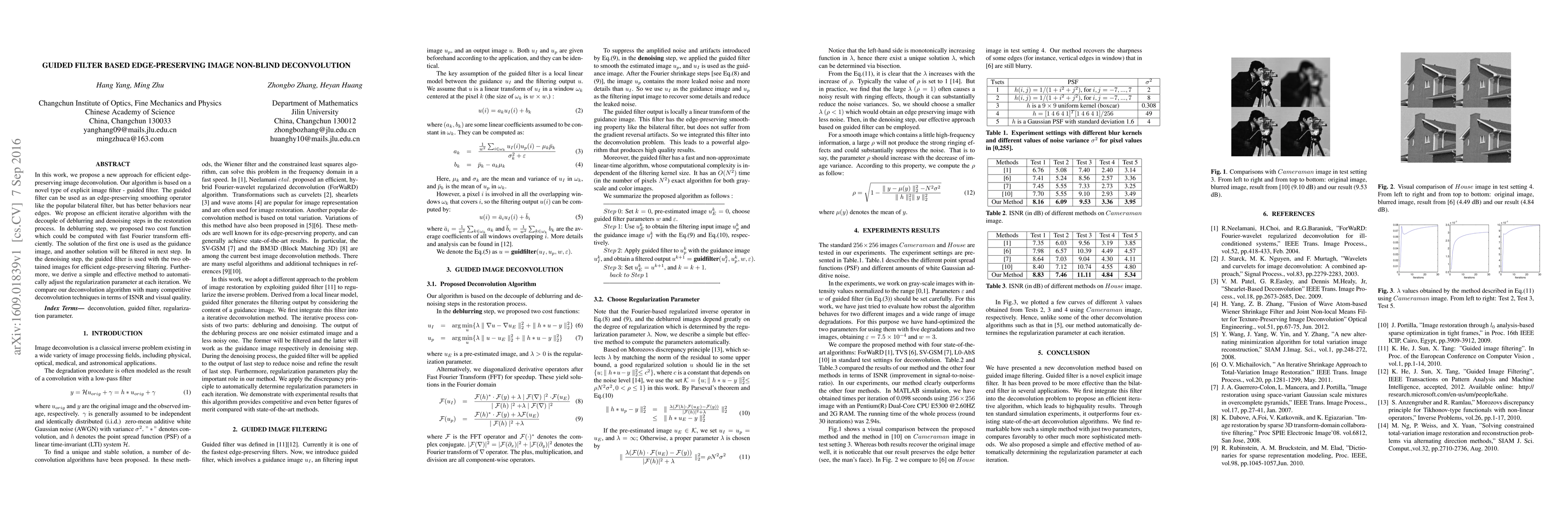 This paper proposes an efficient edge-preserving image deconvolution method using a guided filter. The approach iteratively decouples deblurring and denoising, employs fast Fourier transforms for cost function computation, and automatically adjusts the regularization parameter, outperforming other techniques in terms of signal-to-noise ratio and visual quality.