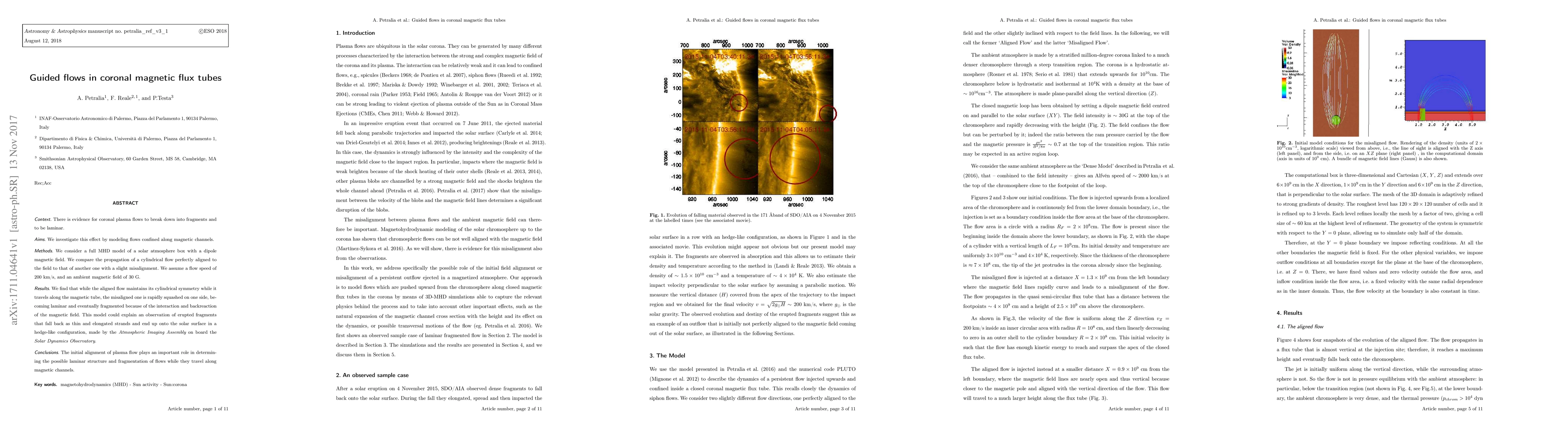 There is evidence for coronal plasma flows to break down into fragments and to be laminar. We investigate this effect by modeling flows confined along magnetic channels. We consider a full MHD model of a solar atmosphere box with a dipole magnetic field. We compare the propagation of a cylindrical flow perfectly aligned to the field to that of another one with a slight misalignment. We assume a flow speed of 200 km/s, and an ambient magnetic field of 30 G. We find that while the aligned flow maintains its cylindrical symmetry while it travels along the magnetic tube, the misaligned one is rapidly squashed on one side, becoming laminar and eventually fragmented because of the interaction and backreaction of the magnetic field. This model could explain an observation of erupted fragments that fall back as thin and elongated strands and end up onto the solar surface in a hedge-like configuration, made by the Atmospheric Imaging Assembly on board the Solar Dynamics Observatory. The initial alignment of plasma flow plays an important role in determining the possible laminar structure and fragmentation of flows while they travel along magnetic channels.