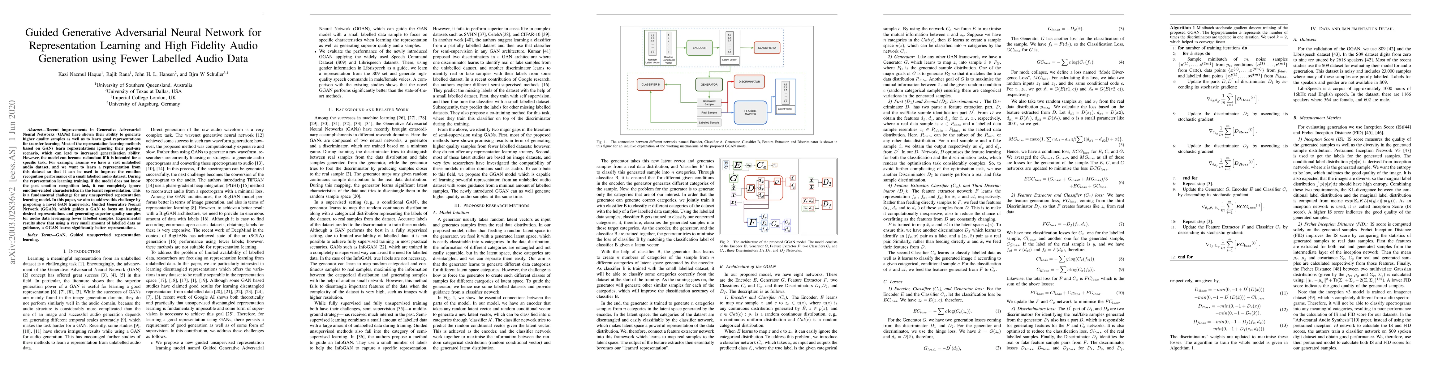This paper proposes a Guided Generative Adversarial Neural Network (GGAN) to learn task-specific representations and generate high-fidelity audio using minimal labelled data. The GGAN framework addresses the challenge of unsupervised representation learning by incorporating guidance from a small labelled dataset, leading to improved performance in downstream tasks like emotion recognition.