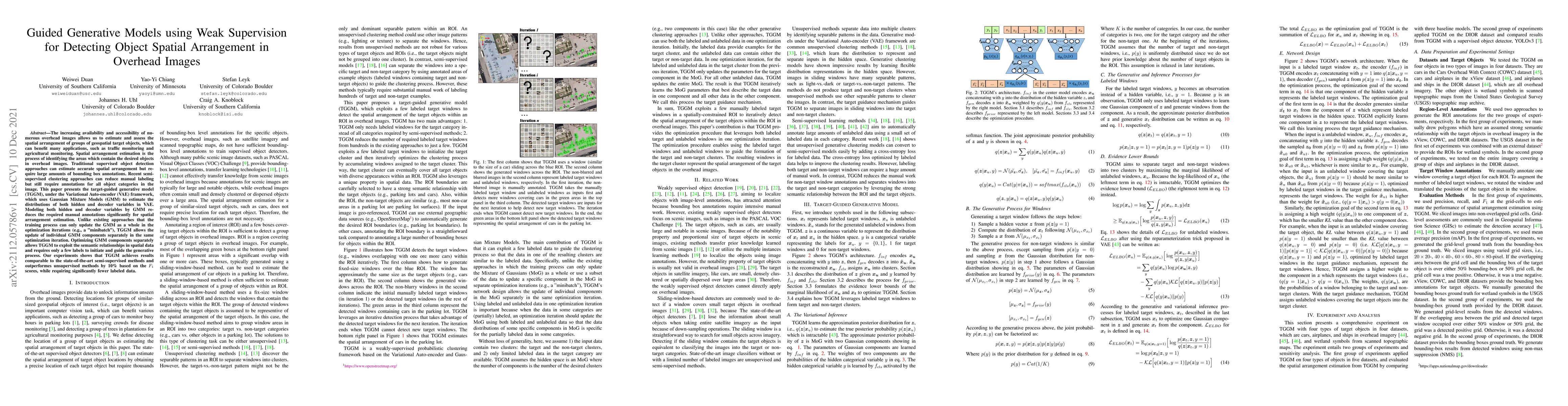 The increasing availability and accessibility of numerous overhead images allows us to estimate and assess the spatial arrangement of groups of geospatial target objects, which can benefit many applications, such as traffic monitoring and agricultural monitoring. Spatial arrangement estimation is the process of identifying the areas which contain the desired objects in overhead images. Traditional supervised object detection approaches can estimate accurate spatial arrangement but require large amounts of bounding box annotations. Recent semi-supervised clustering approaches can reduce manual labeling but still require annotations for all object categories in the image. This paper presents the target-guided generative model (TGGM), under the Variational Auto-encoder (VAE) framework, which uses Gaussian Mixture Models (GMM) to estimate the distributions of both hidden and decoder variables in VAE. Modeling both hidden and decoder variables by GMM reduces the required manual annotations significantly for spatial arrangement estimation. Unlike existing approaches that the training process can only update the GMM as a whole in the optimization iterations (e.g., a "minibatch"), TGGM allows the update of individual GMM components separately in the same optimization iteration. Optimizing GMM components separately allows TGGM to exploit the semantic relationships in spatial data and requires only a few labels to initiate and guide the generative process. Our experiments shows that TGGM achieves results comparable to the state-of-the-art semi-supervised methods and outperforms unsupervised methods by 10% based on the $F_{1}$ scores, while requiring significantly fewer labeled data.