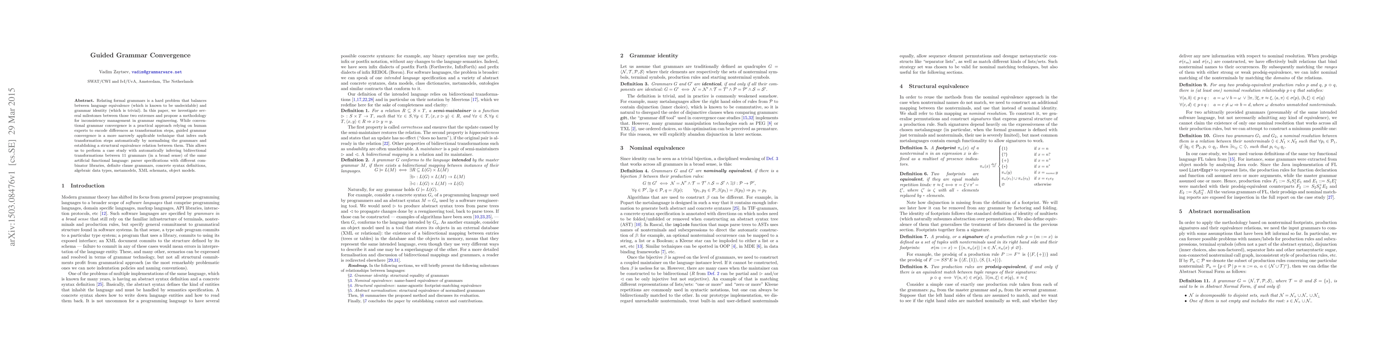 Relating formal grammars is a hard problem that balances between language equivalence (which is known to be undecidable) and grammar identity (which is trivial). In this paper, we investigate several milestones between those two extremes and propose a methodology for inconsistency management in grammar engineering. While conventional grammar convergence is a practical approach relying on human experts to encode differences as transformation steps, guided grammar convergence is a more narrowly applicable technique that infers such transformation steps automatically by normalising the grammars and establishing a structural equivalence relation between them. This allows us to perform a case study with automatically inferring bidirectional transformations between 11 grammars (in a broad sense) of the same artificial functional language: parser specifications with different combinator libraries, definite clause grammars, concrete syntax definitions, algebraic data types, metamodels, XML schemata, object models.