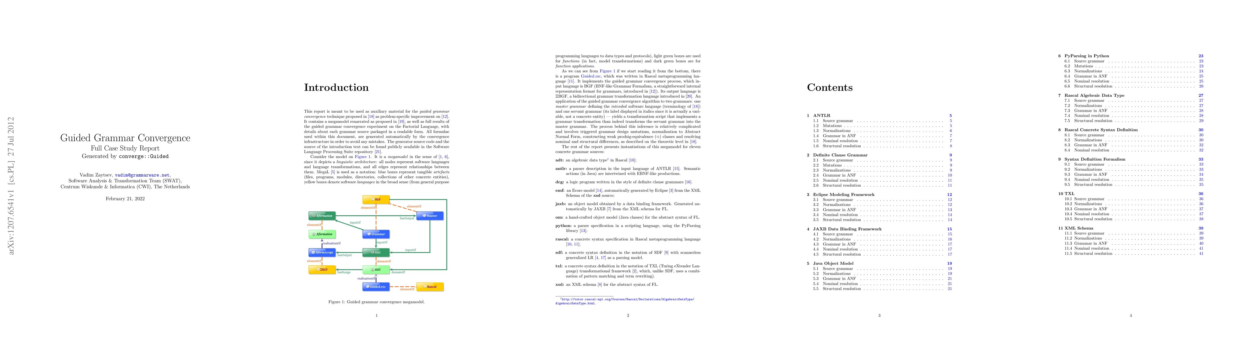 This report is meant to be used as auxiliary material for the guided grammar convergence technique proposed earlier as problem-specific improvement in the topic of convergence of grammars. It contains a narrated MegaL megamodel, as well as full results of the guided grammar convergence experiment on the Factorial Language, with details about each grammar source packaged in a readable form. All formulae used within this document, are generated automatically by the convergence infrastructure in order to avoid any mistakes. The generator source code and the source of the introduction text can be found publicly available in the Software Language Processing Suite repository.