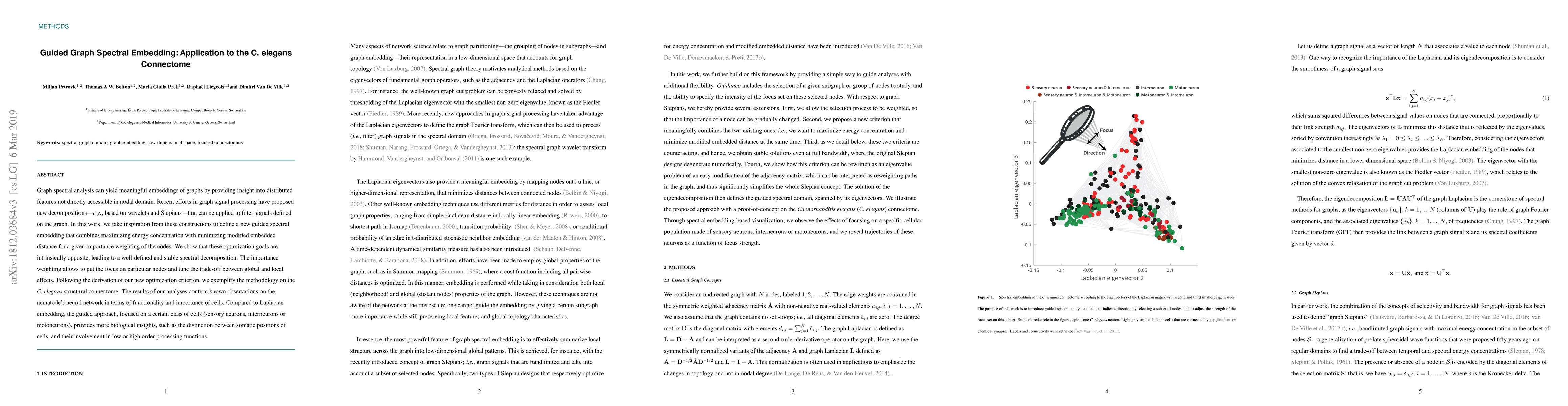 Graph spectral analysis can yield meaningful embeddings of graphs by providing insight into distributed features not directly accessible in nodal domain. Recent efforts in graph signal processing have proposed new decompositions-e.g., based on wavelets and Slepians-that can be applied to filter signals defined on the graph. In this work, we take inspiration from these constructions to define a new guided spectral embedding that combines maximizing energy concentration with minimizing modified embedded distance for a given importance weighting of the nodes. We show these optimization goals are intrinsically opposite, leading to a well-defined and stable spectral decomposition. The importance weighting allows to put the focus on particular nodes and tune the trade-off between global and local effects. Following the derivation of our new optimization criterion and its linear approximation, we exemplify the methodology on the C. elegans structural connectome. The results of our analyses confirm known observations on the nematode's neural network in terms of functionality and importance of cells. Compared to Laplacian embedding, the guided approach, focused on a certain class of cells (sensory, inter- and motoneurons), provides more biological insights, such as the distinction between somatic positions of cells, and their involvement in low or high order processing functions.