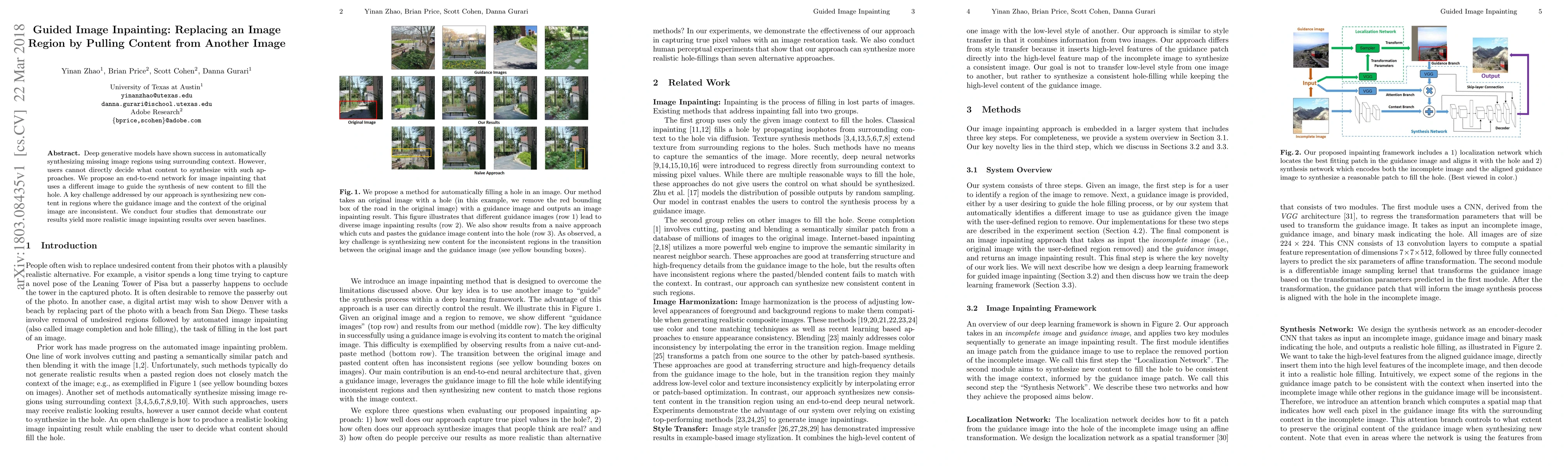 Researchers propose a new approach to image inpainting that uses another image to guide the synthesis of missing content, outperforming seven baselines in producing more realistic results.