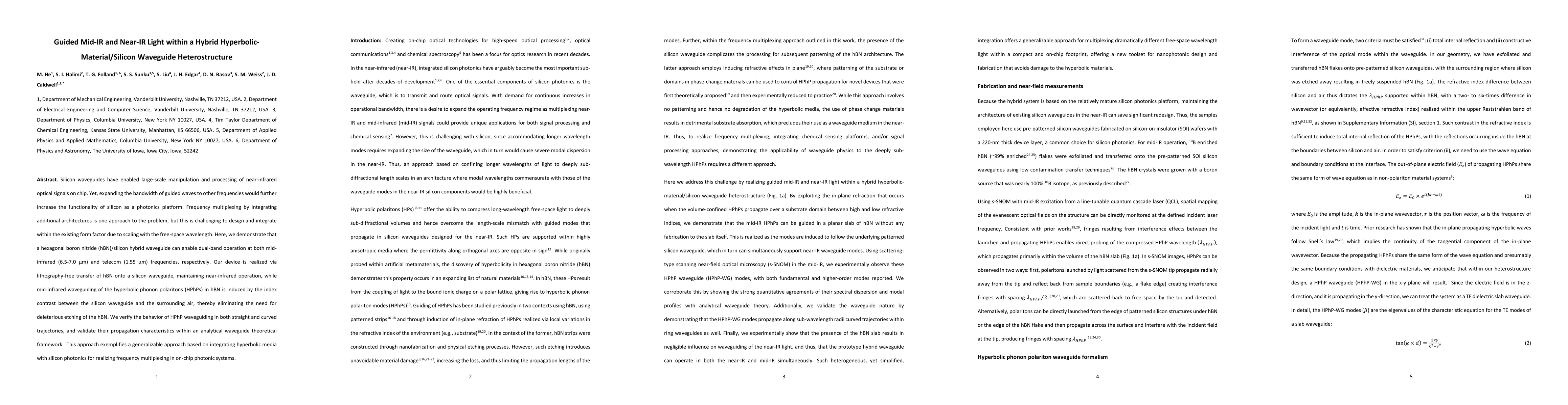 The research demonstrates a hybrid waveguide using hexagonal boron nitride (hBN) and silicon, enabling simultaneous operation in both mid-infrared (6.5-7.0 um) and telecom (1.55 um) frequency bands. This is achieved through lithography-free transfer of hBN onto silicon waveguides, preserving near-infrared functionality and exploiting the index contrast for mid-infrared hyperbolic phonon polariton (HPhP) waveguiding, paving the way for frequency multiplexing in on-chip photonics.