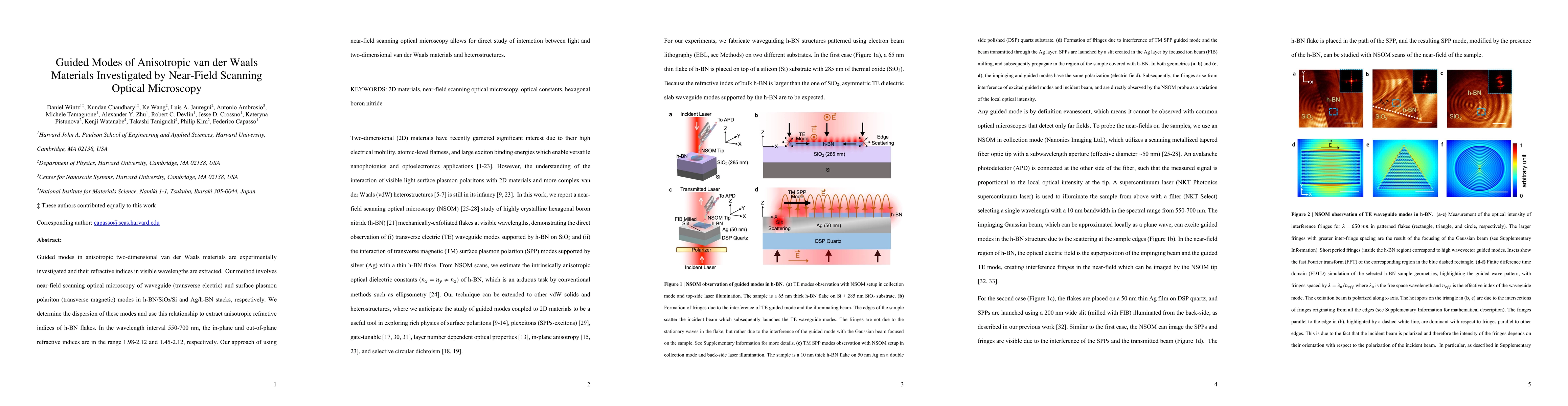 This study investigates guided modes in anisotropic van der Waals materials using near-field scanning optical microscopy, extracting refractive indices for h-BN flakes in visible wavelengths. The method reveals anisotropic refractive indices ranging from 1.98-2.12 in-plane and 1.45-2.12 out-of-plane in the 550-700 nm range.