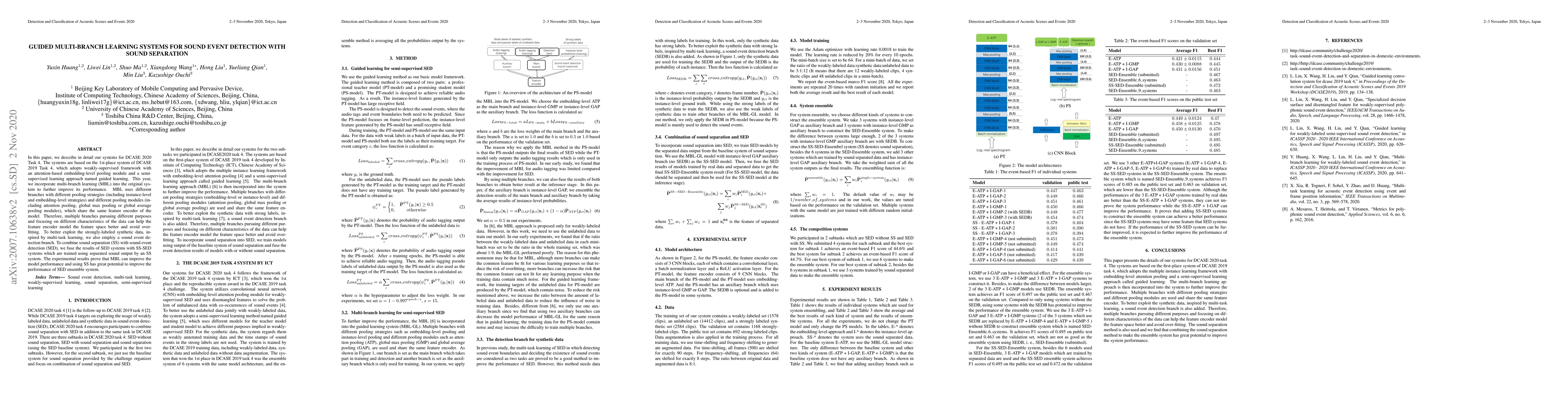 In this paper, we describe in detail our systems for DCASE 2020 Task 4. The systems are based on the 1st-place system of DCASE 2019 Task 4, which adopts weakly-supervised framework with an attention-based embedding-level pooling module and a semi-supervised learning approach named guided learning. This year, we incorporate multi-branch learning (MBL) into the original system to further improve its performance. MBL uses different branches with different pooling strategies (including instance-level and embedding-level strategies) and different pooling modules (including attention pooling, global max pooling or global average pooling modules), which share the same feature encoder of the model. Therefore, multiple branches pursuing different purposes and focusing on different characteristics of the data can help the feature encoder model the feature space better and avoid over-fitting. To better exploit the strongly-labeled synthetic data, inspired by multi-task learning, we also employ a sound event detection branch. To combine sound separation (SS) with sound event detection (SED), we fuse the results of SED systems with SS-SED systems which are trained using separated sound output by an SS system. The experimental results prove that MBL can improve the model performance and using SS has great potential to improve the performance of SED ensemble system.