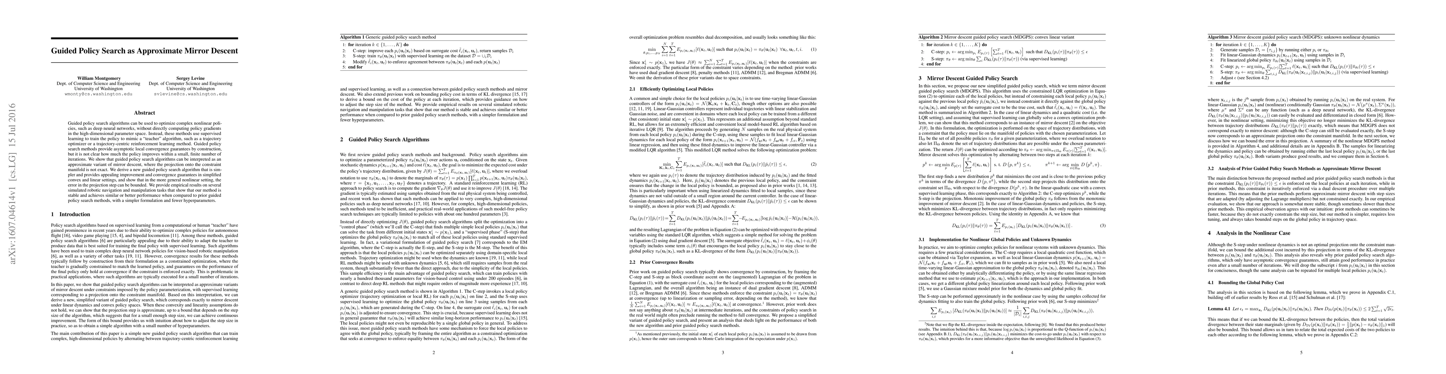 This paper proposes a new guided policy search algorithm interpreted as an approximate mirror descent, offering simpler convergence guarantees and fewer hyperparameters. Empirical results demonstrate stable performance and comparable or superior results in robotic tasks.
