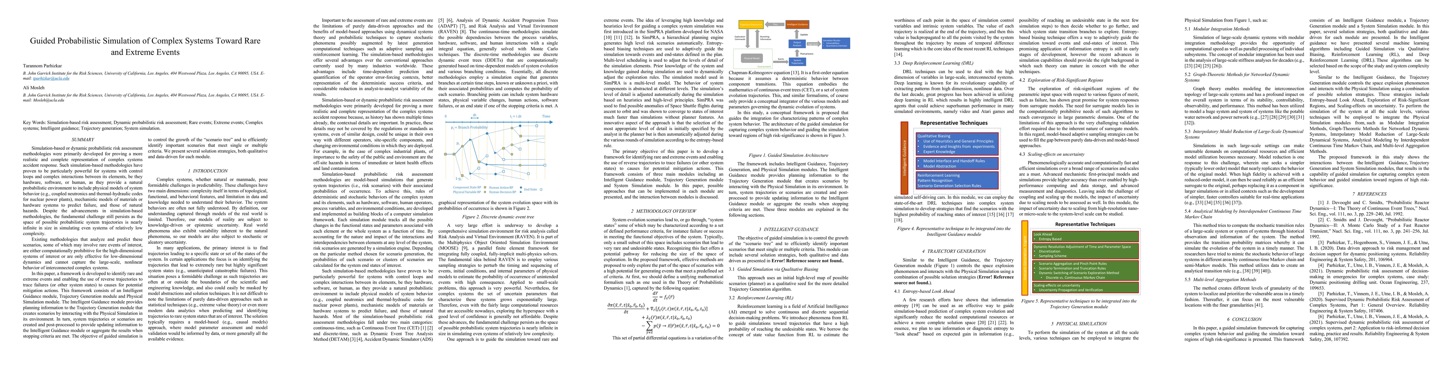 Simulation based or dynamic probabilistic risk assessment methodologies were primarily developed for proving a more realistic and complete representation of complex systems accident response. Such simulation based methodologies have proven to be particularly powerful for systems with control loops and complex interactions between its elements, be they hardware, software, or human, as they provide a natural probabilistic environment to include physical models of system behavior (e.g., coupled neutronics and thermal hydraulic codes for nuclear power plants), mechanistic models of materials or hardware systems to predict failure, and those of natural hazards. Despite the advancements in simulation based methodologies, the fundamental challenge still persists as the space of possible probabilistic system trajectories is nearly infinite in size in simulating even systems of relatively low complexity. In this paper, a framework is developed to identify rare and extreme events and enabling the use of reverse trajectories to trace failures (or other system states) to causes for potential mitigation actions. This framework consists of an Intelligent Guidance module, Trajectory Generation module and Physical Simulation module. The Intelligent Guidance module provides planning information to the Trajectory Generation module that creates scenarios by interacting with the Physical Simulation in its environment. In turn, system trajectories or scenarios are created and post processed to provide updating information to the Intelligent Guidance module or aggregate the results when stopping criteria are met. The objective of guided simulation is to control the growth of the scenario tree and to efficiently identify important scenarios that meet single or multiple criteria. We present several solution strategies, both qualitative and data driven for each module.