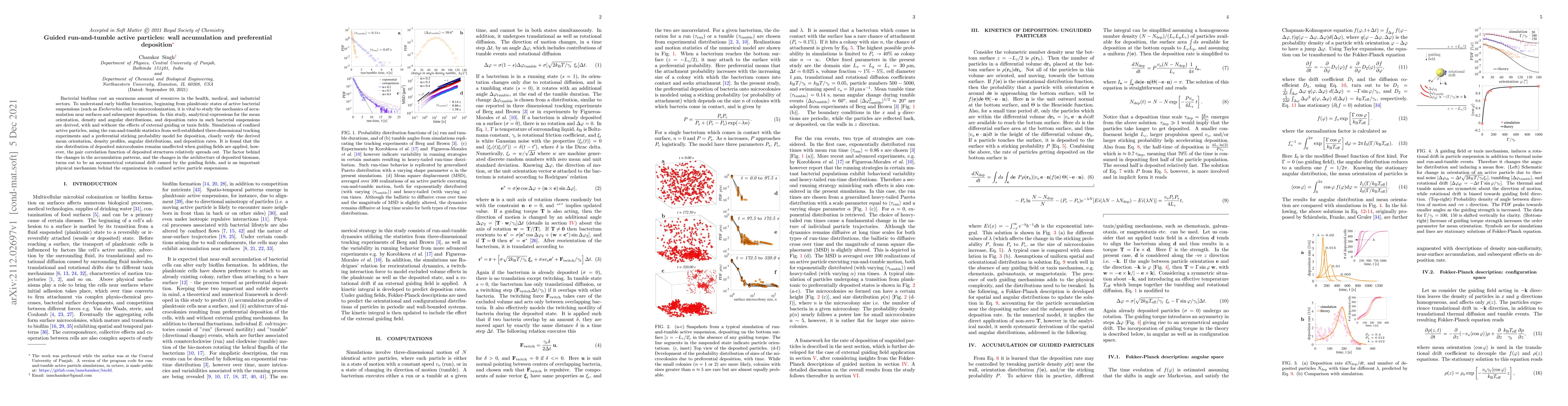 This paper investigates the mechanics of bacterial accumulation near surfaces and biofilm formation, deriving analytical expressions and simulating active particles' behavior. It reveals that guiding fields induce asymmetrical rotational drift, altering the architecture of deposited biomass without affecting microcolony size distribution.