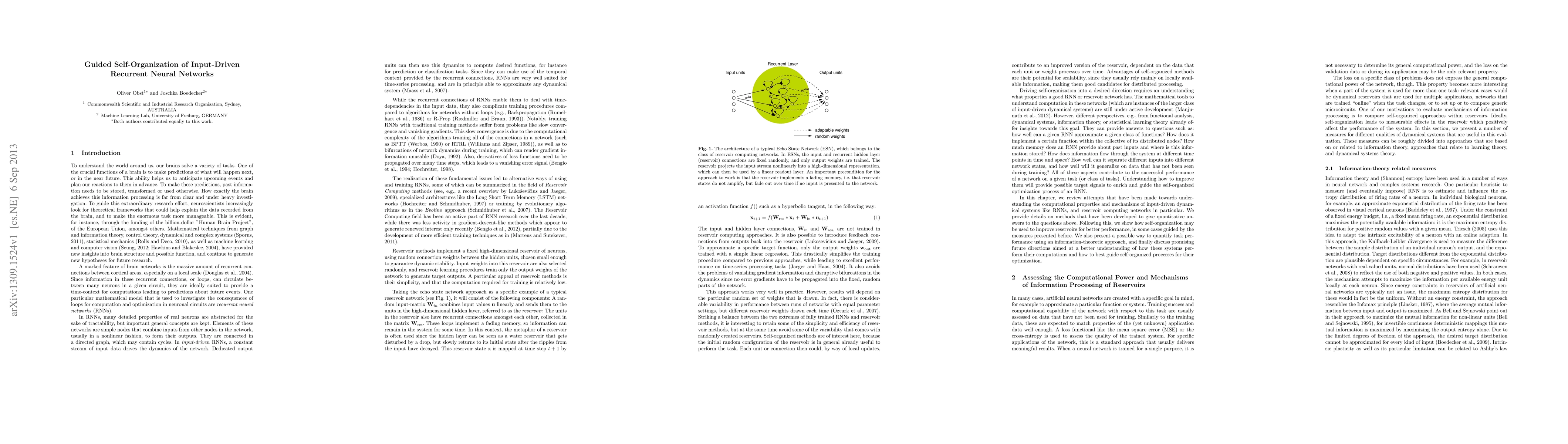 This paper explores computational properties of input-driven recurrent neural networks, particularly reservoir computing, and reviews methods for their quantitative analysis. It discusses self-organization techniques to enhance reservoir performance and proposes an information-theoretic approach for quantifying task performance, while also outlining future research directions.