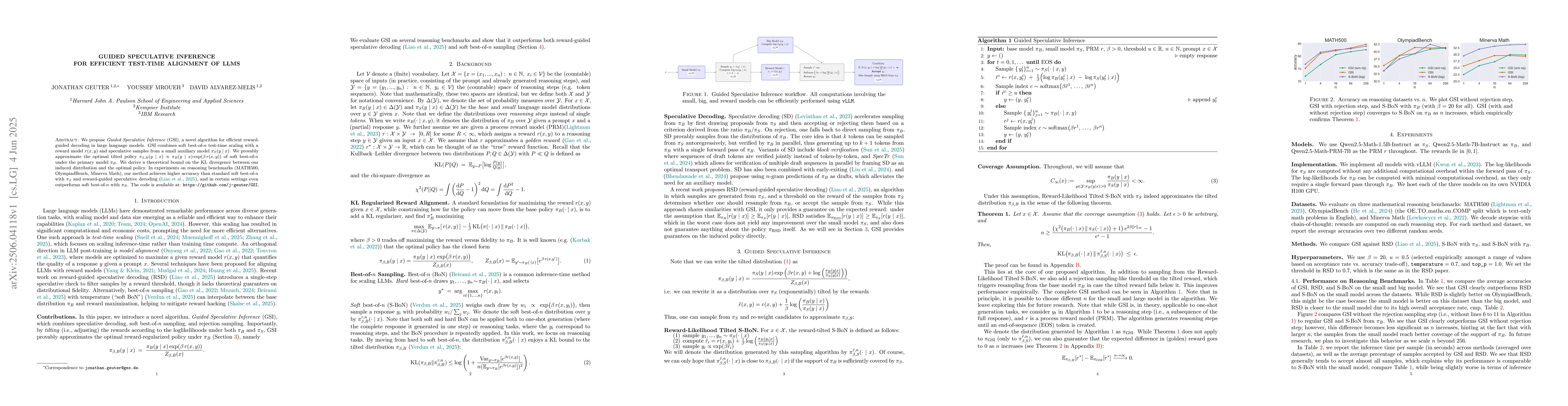 A new algorithm called Guided Speculative Inference (GSI) improves test-time alignment in large language models by combining reward guidance with speculative samples, leading to higher accuracy than traditional methods.