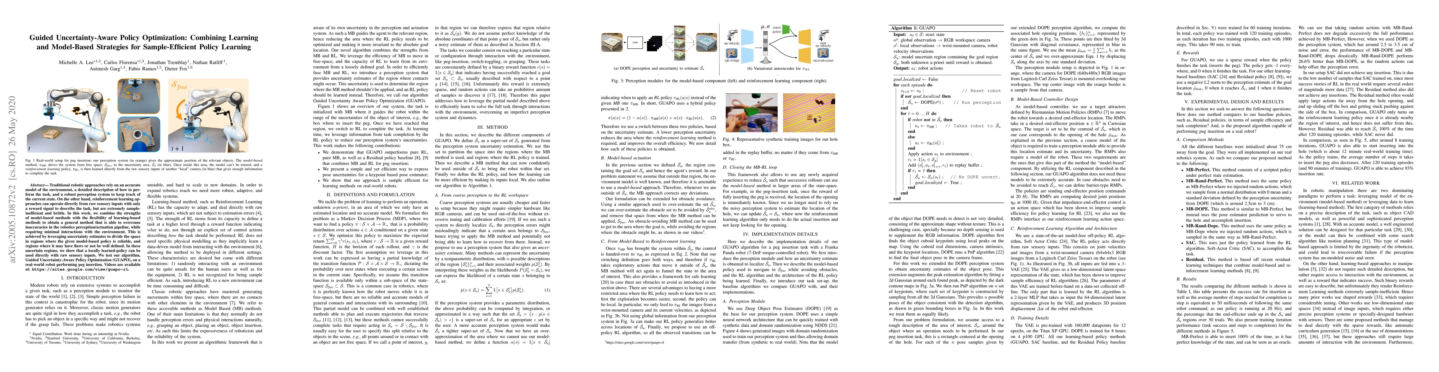 This paper proposes Guided Uncertainty-Aware Policy Optimization (GUAPO) to combine model-based and learning-based strategies for sample-efficient policy learning in robotics. GUAPO leverages uncertainty estimates to switch between model-based and locally learned policies, enhancing robustness and efficiency.