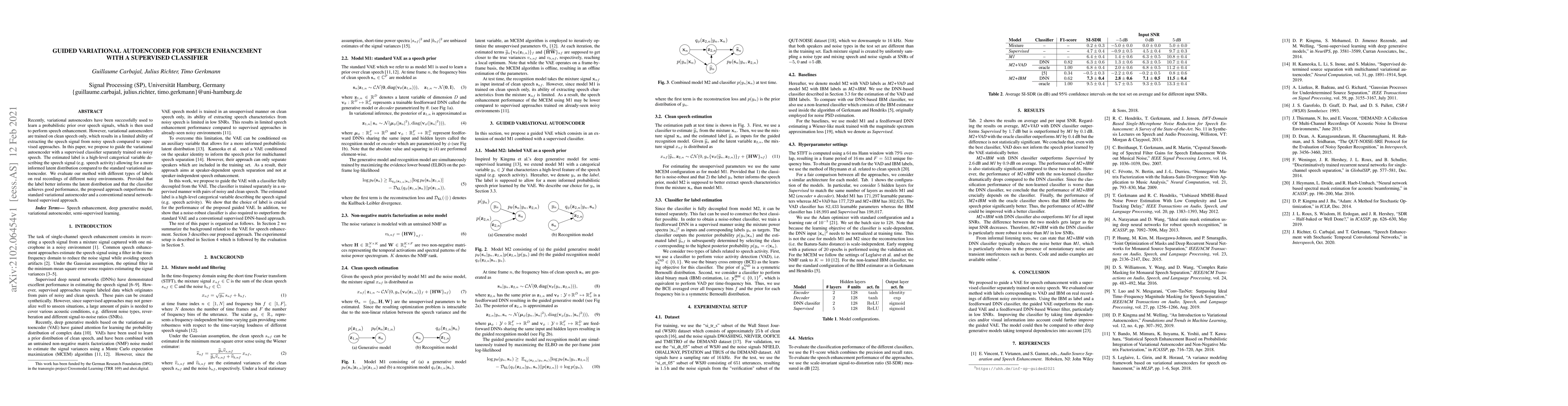 This paper proposes a Guided Variational Autoencoder (GVAE) for speech enhancement that incorporates a supervised classifier trained on noisy speech to inform the latent distribution, improving speech extraction from noise compared to standard VAEs. The approach uses high-level categorical labels to guide the VAE, achieving better performance in noisy environments.