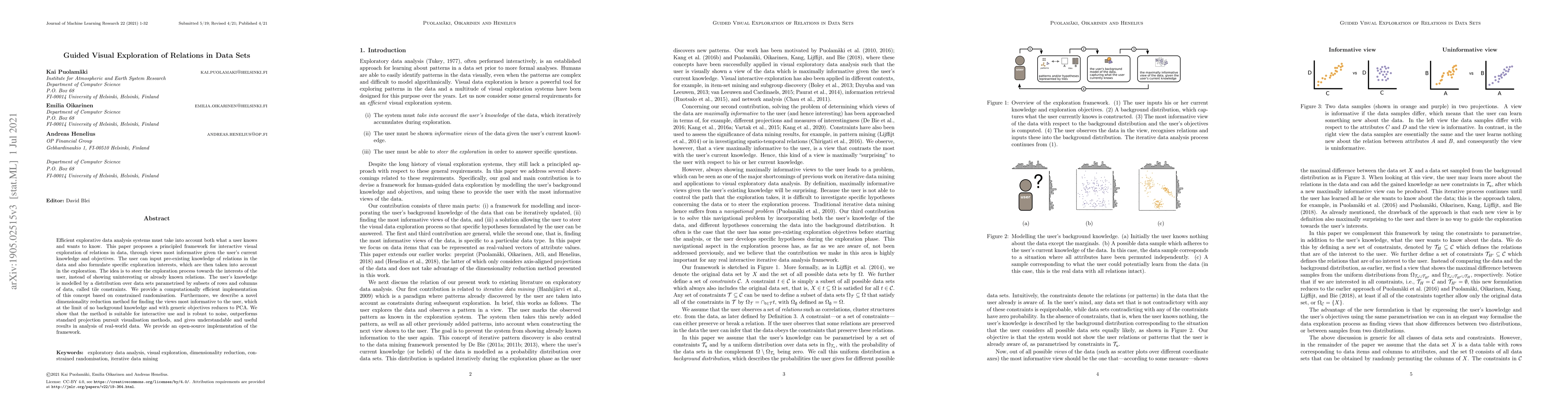 Efficient explorative data analysis systems must take into account both what a user knows and wants to know. This paper proposes a principled framework for interactive visual exploration of relations in data, through views most informative given the user's current knowledge and objectives. The user can input pre-existing knowledge of relations in the data and also formulate specific exploration interests, which are then taken into account in the exploration. The idea is to steer the exploration process towards the interests of the user, instead of showing uninteresting or already known relations. The user's knowledge is modelled by a distribution over data sets parametrised by subsets of rows and columns of data, called tile constraints. We provide a computationally efficient implementation of this concept based on constrained randomisation. Furthermore, we describe a novel dimensionality reduction method for finding the views most informative to the user, which at the limit of no background knowledge and with generic objectives reduces to PCA. We show that the method is suitable for interactive use and is robust to noise, outperforms standard projection pursuit visualisation methods, and gives understandable and useful results in analysis of real-world data. We provide an open-source implementation of the framework.