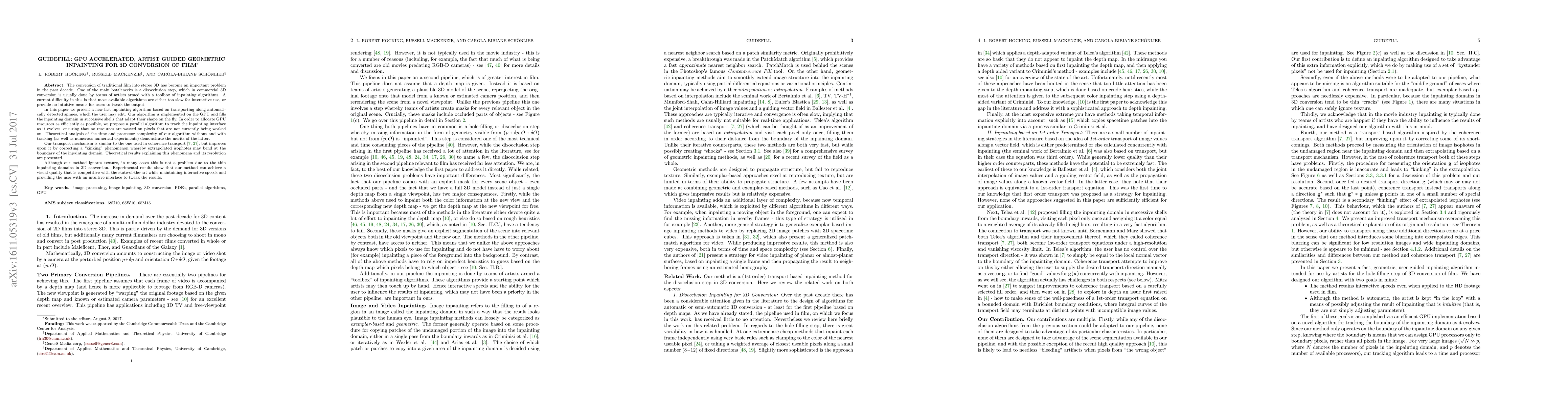 This paper presents a GPU-accelerated, artist-guided geometric inpainting algorithm for converting 2D films into stereo 3D, addressing the bottleneck of disocclusion. The proposed method efficiently tracks the inpainting interface and adapts its shape in successive shells, achieving interactive speeds and competitive visual quality while allowing users to edit the inpainting domain.
