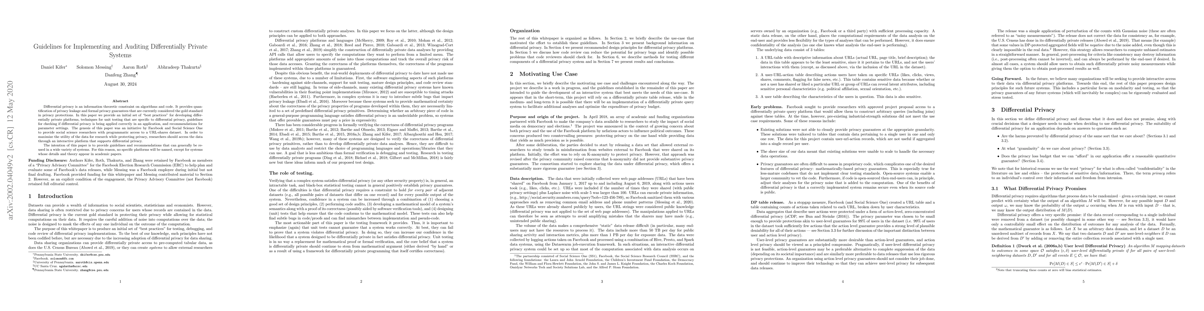 This paper outlines best practices for developing differentially private systems, including unit testing techniques specific to differential privacy, auditing guidelines, and parameter settings recommendations. It aims to provide reusable guidelines for a wide range of systems, inspired by Facebook and Social Science One's initiative to protect privacy in social science research data.