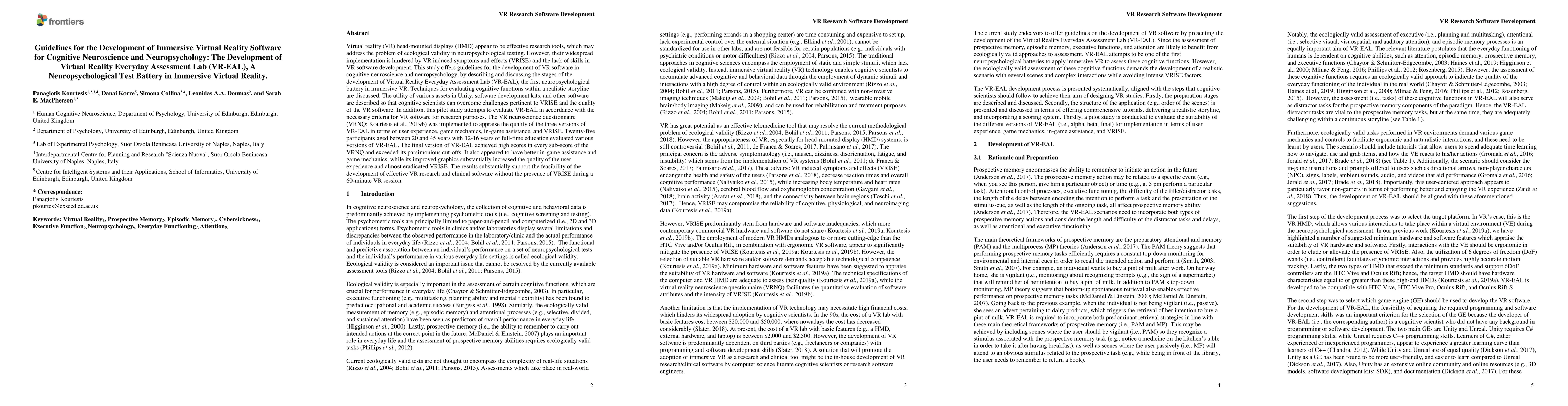 Virtual reality (VR) head-mounted displays (HMD) appear to be effective research tools, which may address the problem of ecological validity in neuropsychological testing. However, their widespread implementation is hindered by VR induced symptoms and effects (VRISE) and the lack of skills in VR software development. This study offers guidelines for the development of VR software in cognitive neuroscience and neuropsychology, by describing and discussing the stages of the development of Virtual Reality Everyday Assessment Lab (VR-EAL), the first neuropsychological battery in immersive VR. Techniques for evaluating cognitive functions within a realistic storyline are discussed. The utility of various assets in Unity, software development kits, and other software are described so that cognitive scientists can overcome challenges pertinent to VRISE and the quality of the VR software. In addition, this pilot study attempts to evaluate VR-EAL in accordance with the necessary criteria for VR software for research purposes. The VR neuroscience questionnaire (VRNQ; Kourtesis et al., 2019b) was implemented to appraise the quality of the three versions of VR-EAL in terms of user experience, game mechanics, in-game assistance, and VRISE. Twenty-five participants aged between 20 and 45 years with 12-16 years of full-time education evaluated various versions of VR-EAL. The final version of VR-EAL achieved high scores in every sub-score of the VRNQ and exceeded its parsimonious cut-offs. It also appeared to have better in-game assistance and game mechanics, while its improved graphics substantially increased the quality of the user experience and almost eradicated VRISE. The results substantially support the feasibility of the development of effective VR research and clinical software without the presence of VRISE during a 60-minute VR session.