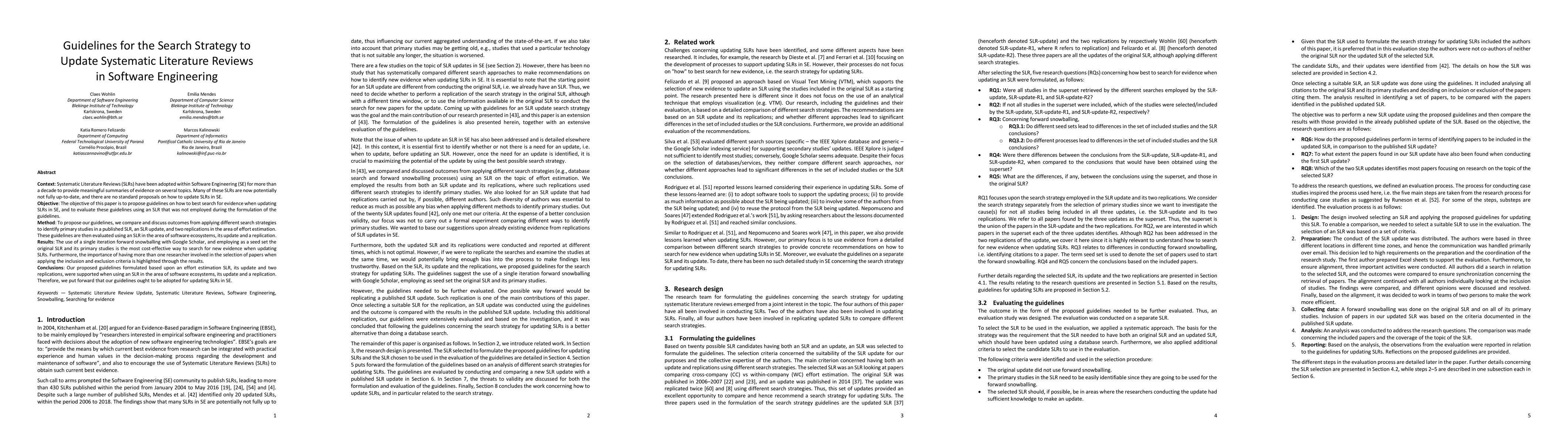 This paper proposes guidelines for updating Systematic Literature Reviews (SLRs) in Software Engineering by comparing different search strategies for identifying new evidence. The guidelines, tested using an SLR in software ecosystems, suggest that a single iteration forward snowballing with Google Scholar and multi-researcher involvement in paper selection is most effective.