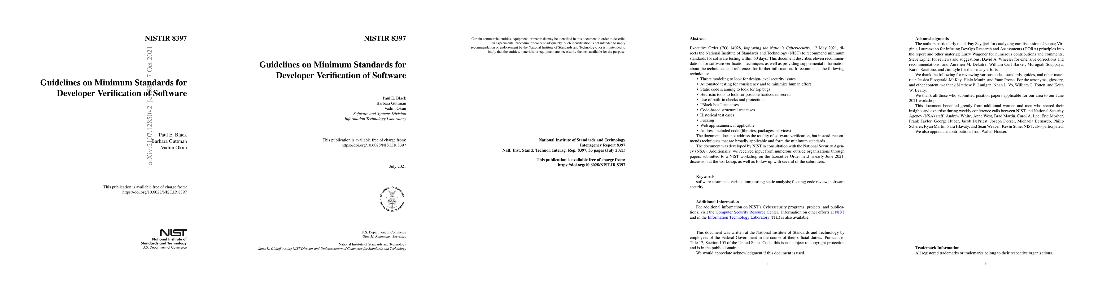 Executive Order (EO) 14028, "Improving the Nation's Cybersecurity", 12 May 2021, directs the National Institute of Standards and Technology (NIST) to recommend minimum standards for software testing within 60 days. This document describes eleven recommendations for software verification techniques as well as providing supplemental information about the techniques and references for further information. It recommends the following techniques: Threat modeling to look for design-level security issues Automated testing for consistency and to minimize human effort Static code scanning to look for top bugs Heuristic tools to look for possible hardcoded secrets Use of built-in checks and protections "Black box" test cases Code-based structural test cases Historical test cases Fuzzing Web app scanners, if applicable Address included code (libraries, packages, services) The document does not address the totality of software verification, but instead, recommends techniques that are broadly applicable and form the minimum standards. The document was developed by NIST in consultation with the National Security Agency (NSA). Additionally, we received input from numerous outside organizations through papers submitted to a NIST workshop on the Executive Order held in early June 2021, discussion at the workshop, as well as follow up with several of the submitters.