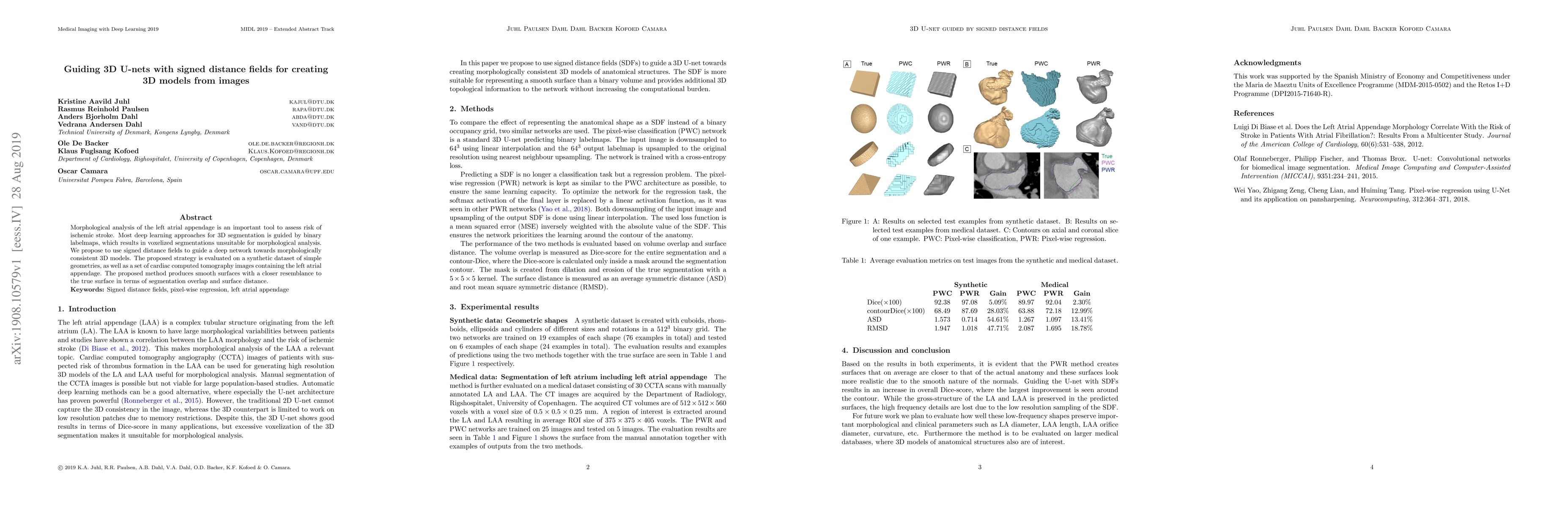 Morphological analysis of the left atrial appendage is an important tool to assess risk of ischemic stroke. Most deep learning approaches for 3D segmentation is guided by binary labelmaps, which results in voxelized segmentations unsuitable for morphological analysis. We propose to use signed distance fields to guide a deep network towards morphologically consistent 3D models. The proposed strategy is evaluated on a synthetic dataset of simple geometries, as well as a set of cardiac computed tomography images containing the left atrial appendage. The proposed method produces smooth surfaces with a closer resemblance to the true surface in terms of segmentation overlap and surface distance.