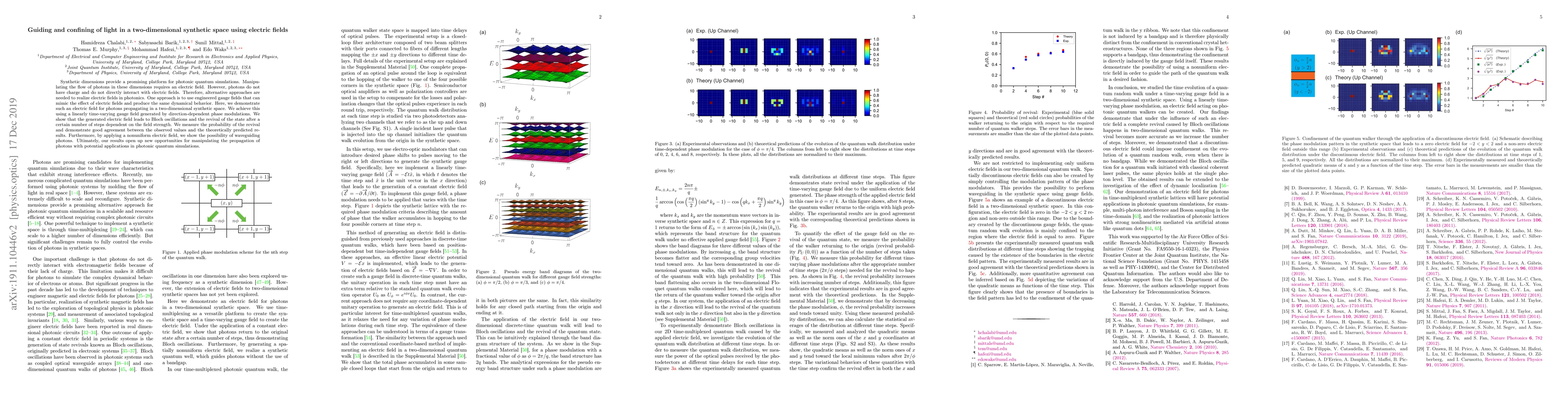 This paper demonstrates the use of engineered gauge fields to mimic electric fields in guiding and confining photons in a two-dimensional synthetic space, achieving Bloch oscillations and waveguiding. The study shows good agreement between experimental results and theoretical predictions, highlighting potential applications in photonic quantum simulations.
